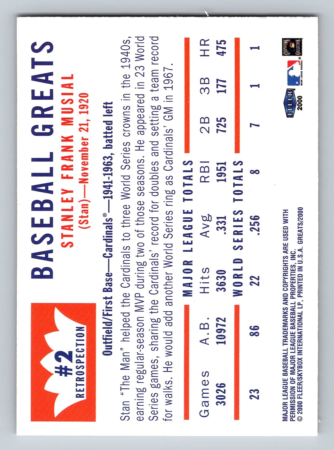 2000 Fleer Greats Of The Game Retrospection Stan Musial Insert Baseball Card - MINT