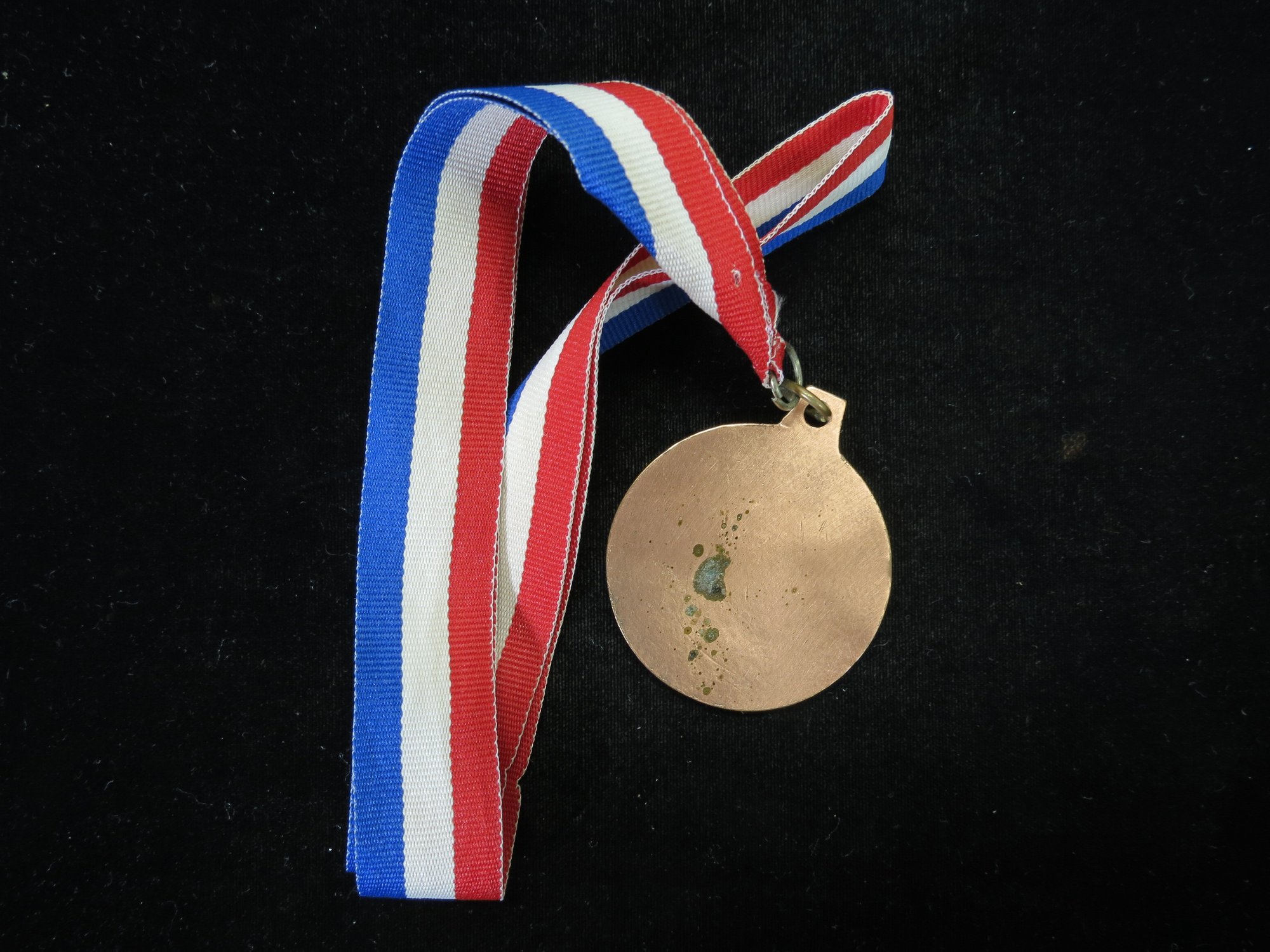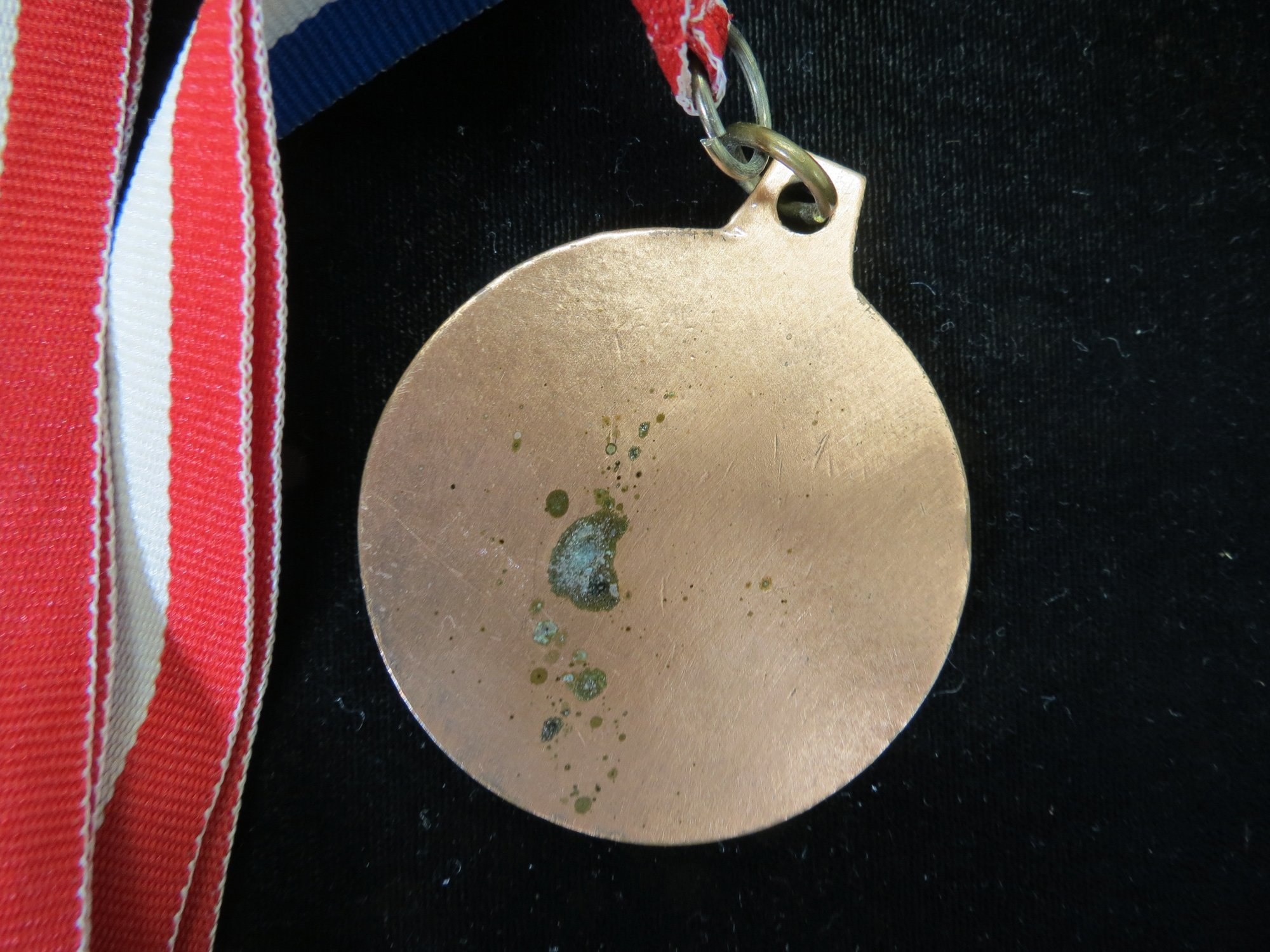 Won by a later participant in the 2002 and 2006 Winter Olympics. Won December 15th. It is undated and looks exactly like the 2000 Medal, but was identified by the athlete as being from the Dec 16th 2001 Qualifying event. 2" diameter. With original red, white and blue ribbon. Some minor scuffing/scratches, excellent overall condition, but there are some spots of corrosion. The consignor wishes that the name not be public, but the name of the participant will be provided to the high bidder (he is well known and has an extensive wiki page).