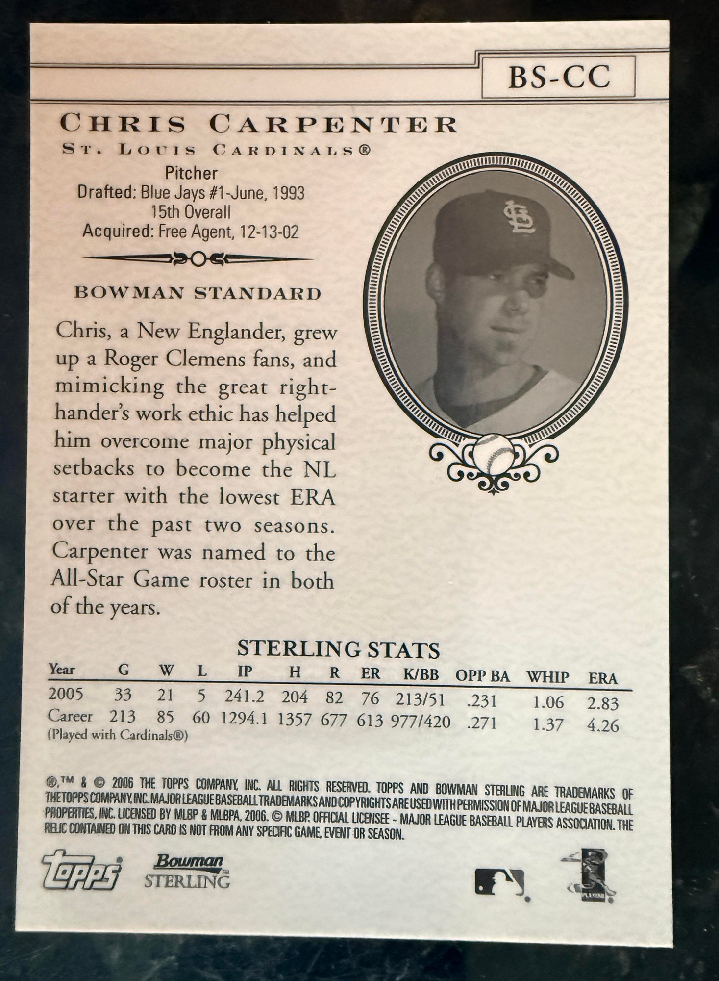 2006 Bowman Sterling Material Card Chris Carpenter Game Used Jersey Baseball Card - Mint