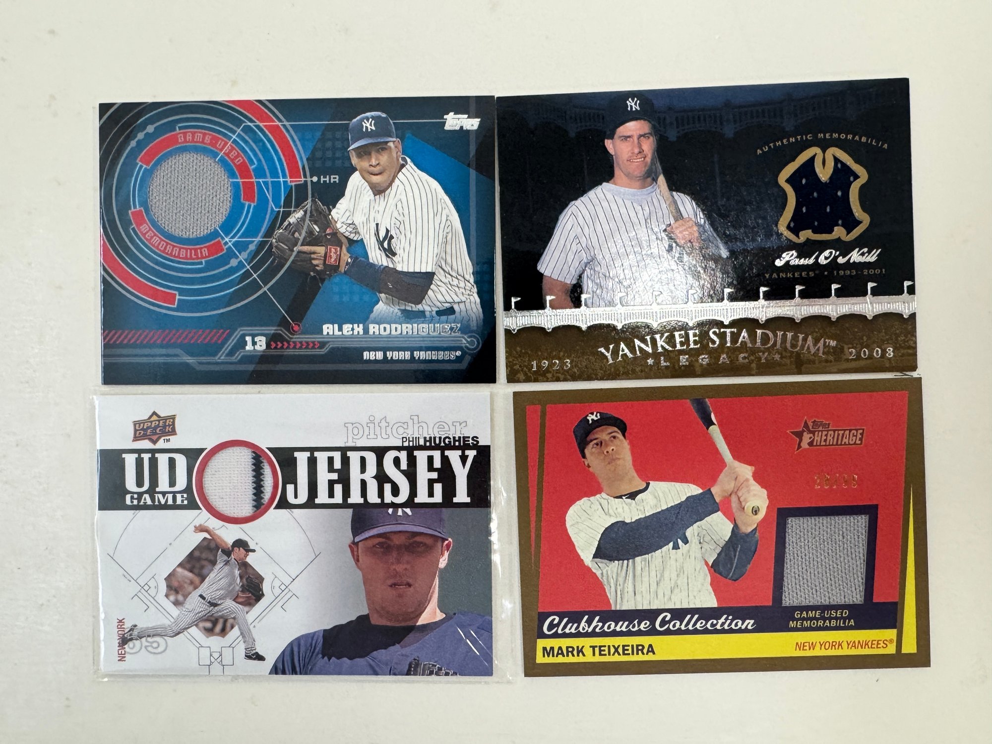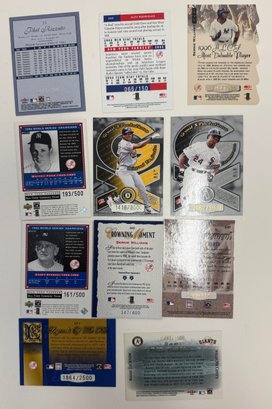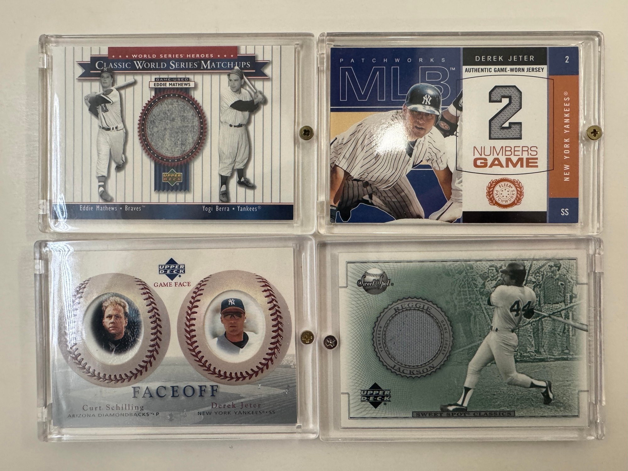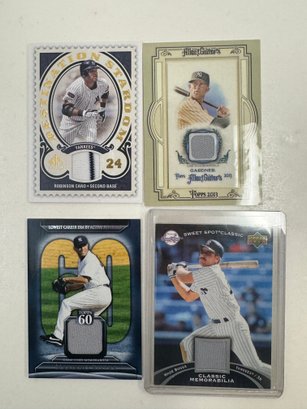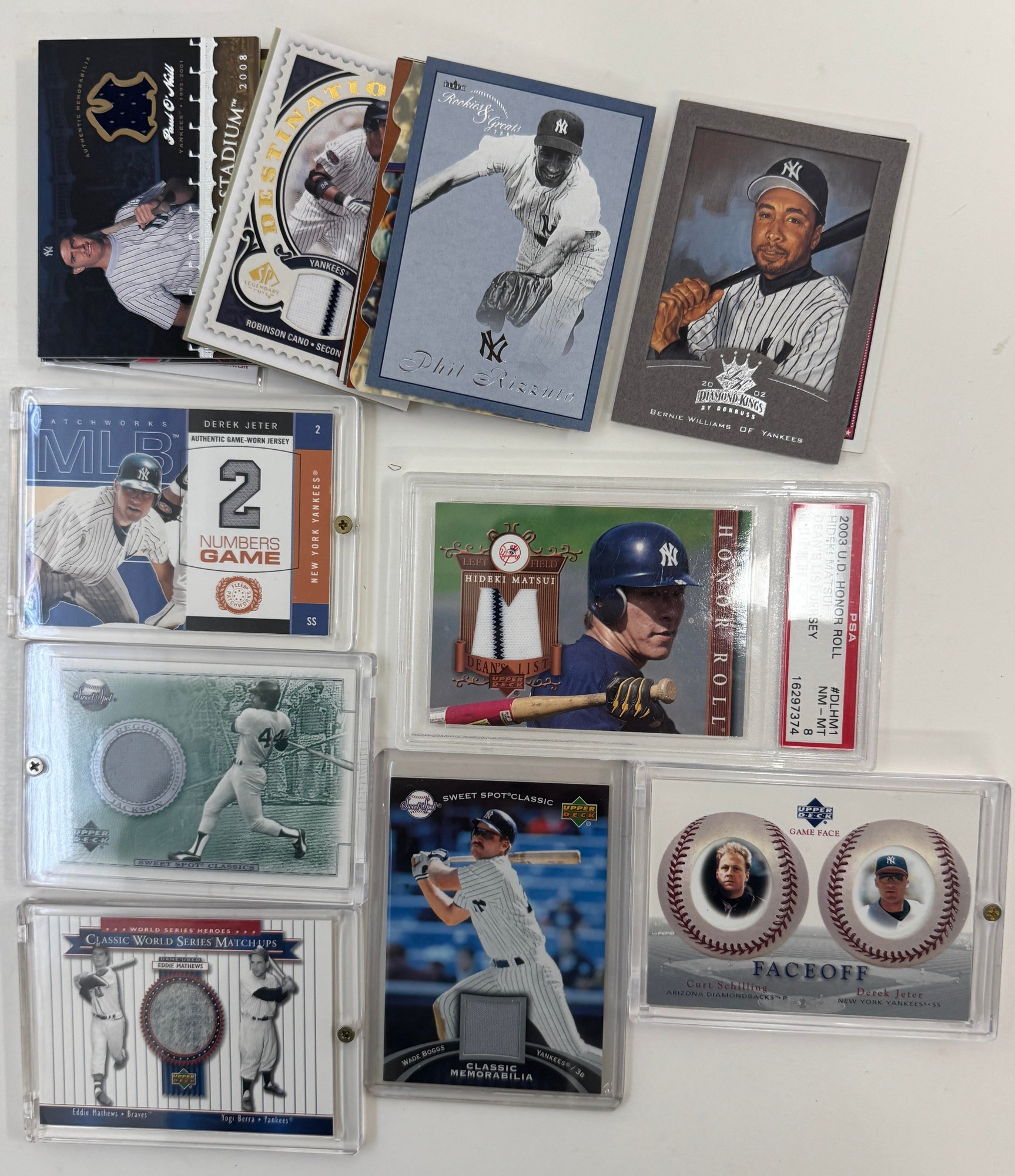 The lot includes many different relic/numbered cards from the New York Yankees. Overall the condition is near mint but being thicker cards some have corner wear.Some of the highlights of this lot is a Eddie Matthews game used relic, Derek Jeter game used relic, as well as a Alex Rodriguez game worn relic. Some of the highlighted players are listed below: