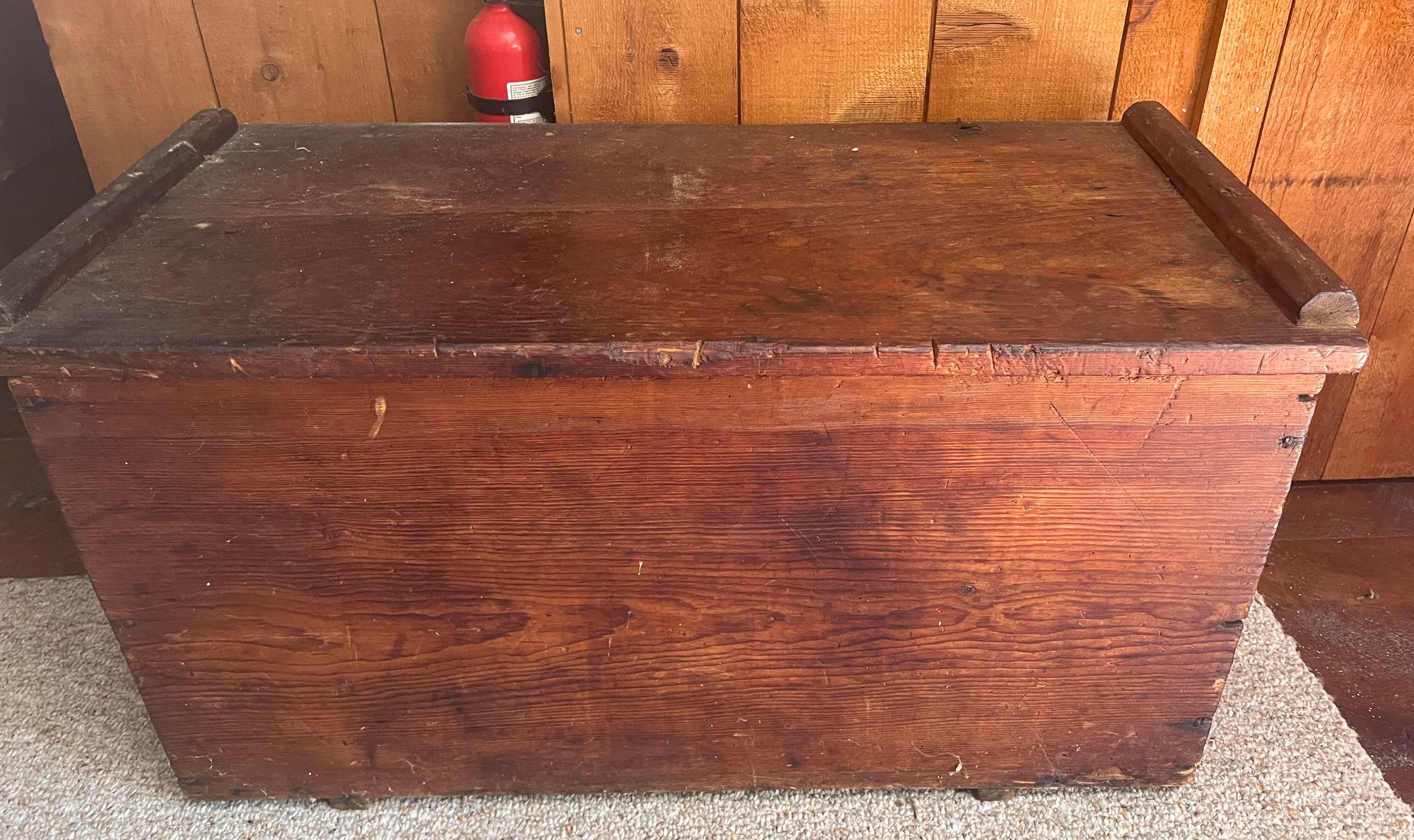 Hand wrought nails. Lid is not attached. 18.5" tall, 36" wide, 18.25" deep. Some dings and chips in the wood gives it even more of that primitive and rustic look.
