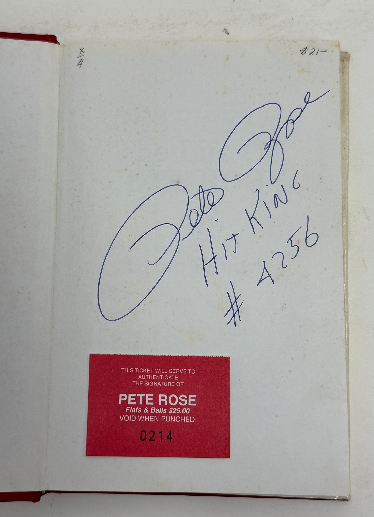 Book is signed by Rose on the first inside page with an inscription “ Hit King #4256”. The book has some foxing as seen by the photos but is overall in good condition. The book comes with the autograph ticket which was used to get the book signed. The book itself is the Dear Pete: The life of Pete Rose.