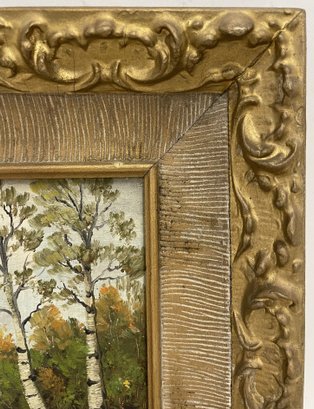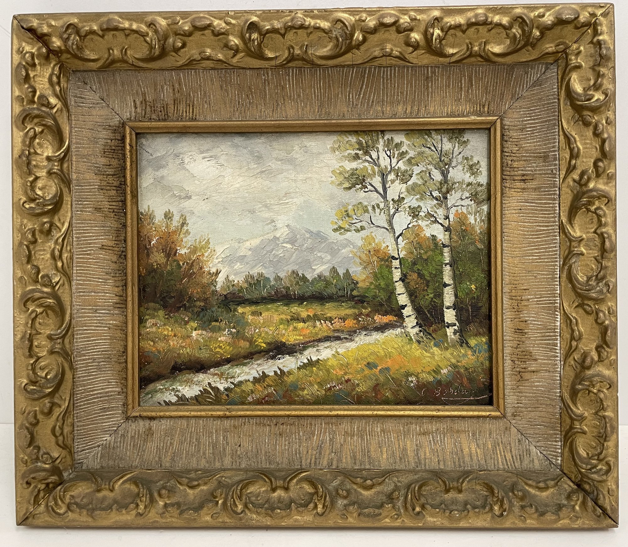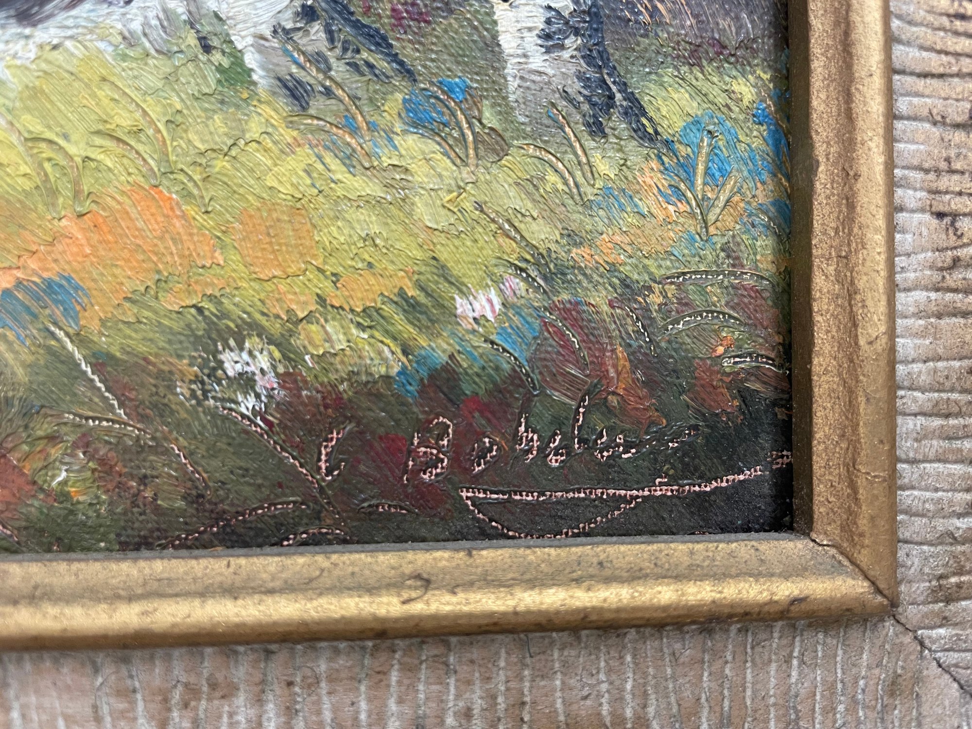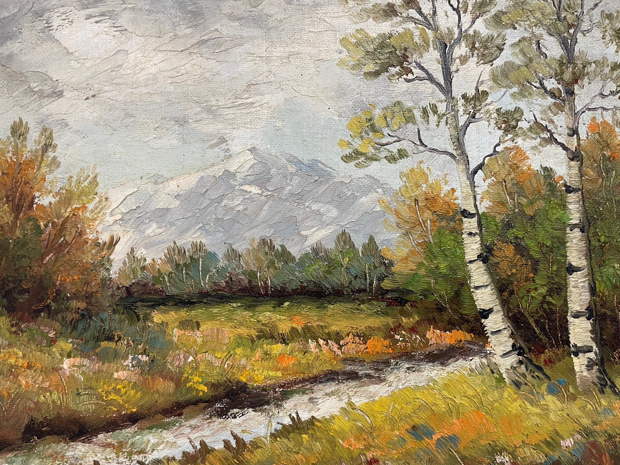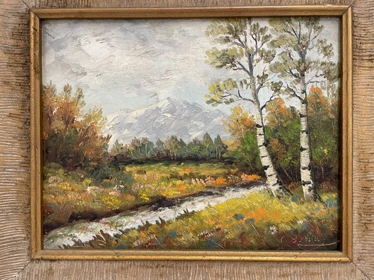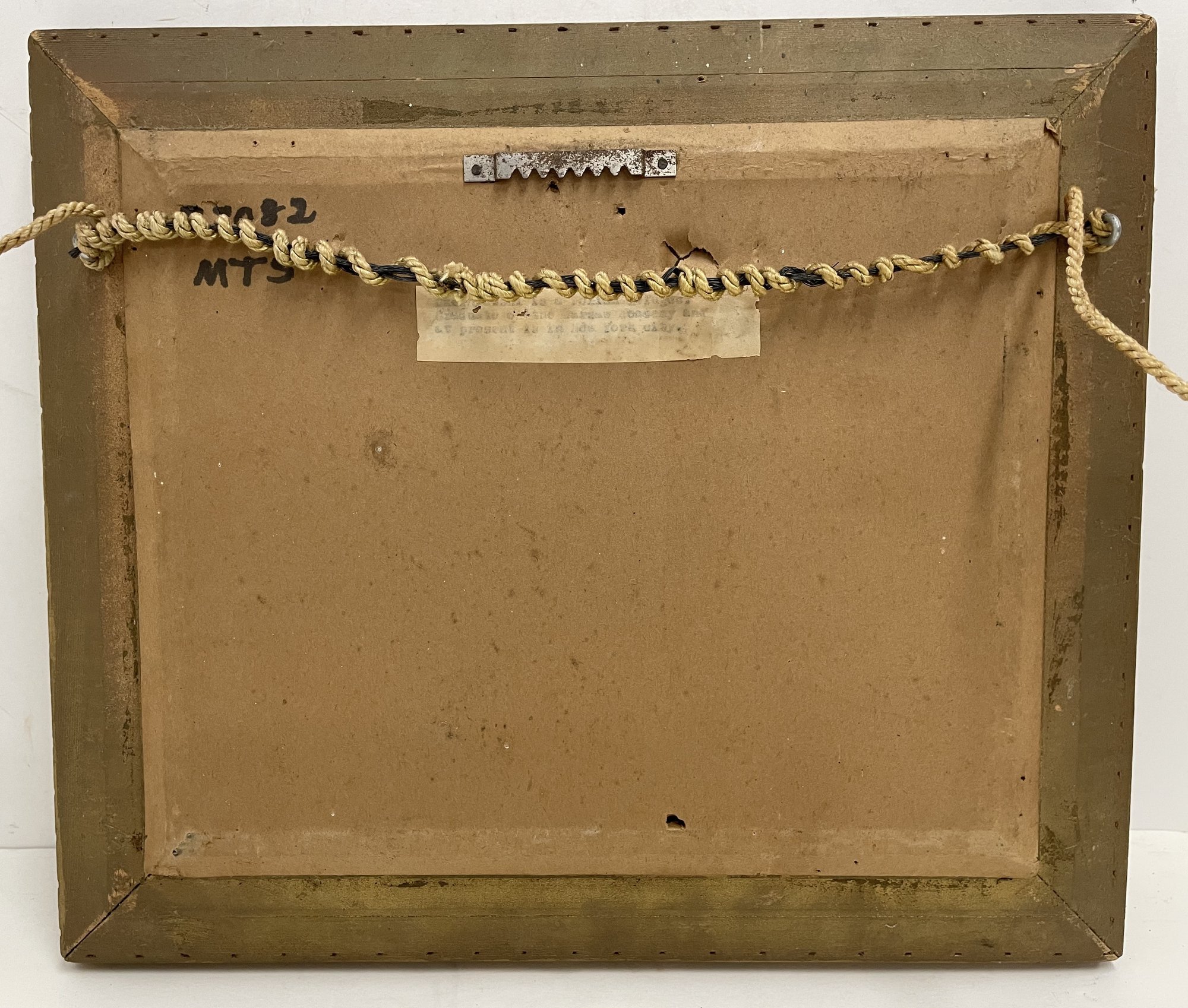 Painting measures 9.75” by 11.5” and is framed to 12.75” by 14.75”. It is signed on teh bottom right hand corner and there is a label attached to the back of the painting with what I would assume is the artist's information although it is quite faded and hard to make out. The painting and frame are in very good condition with average wear.