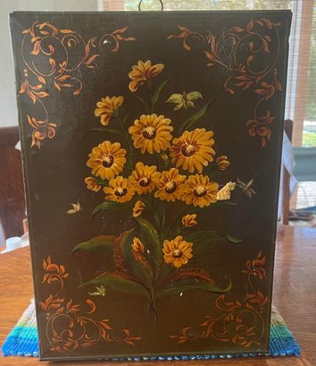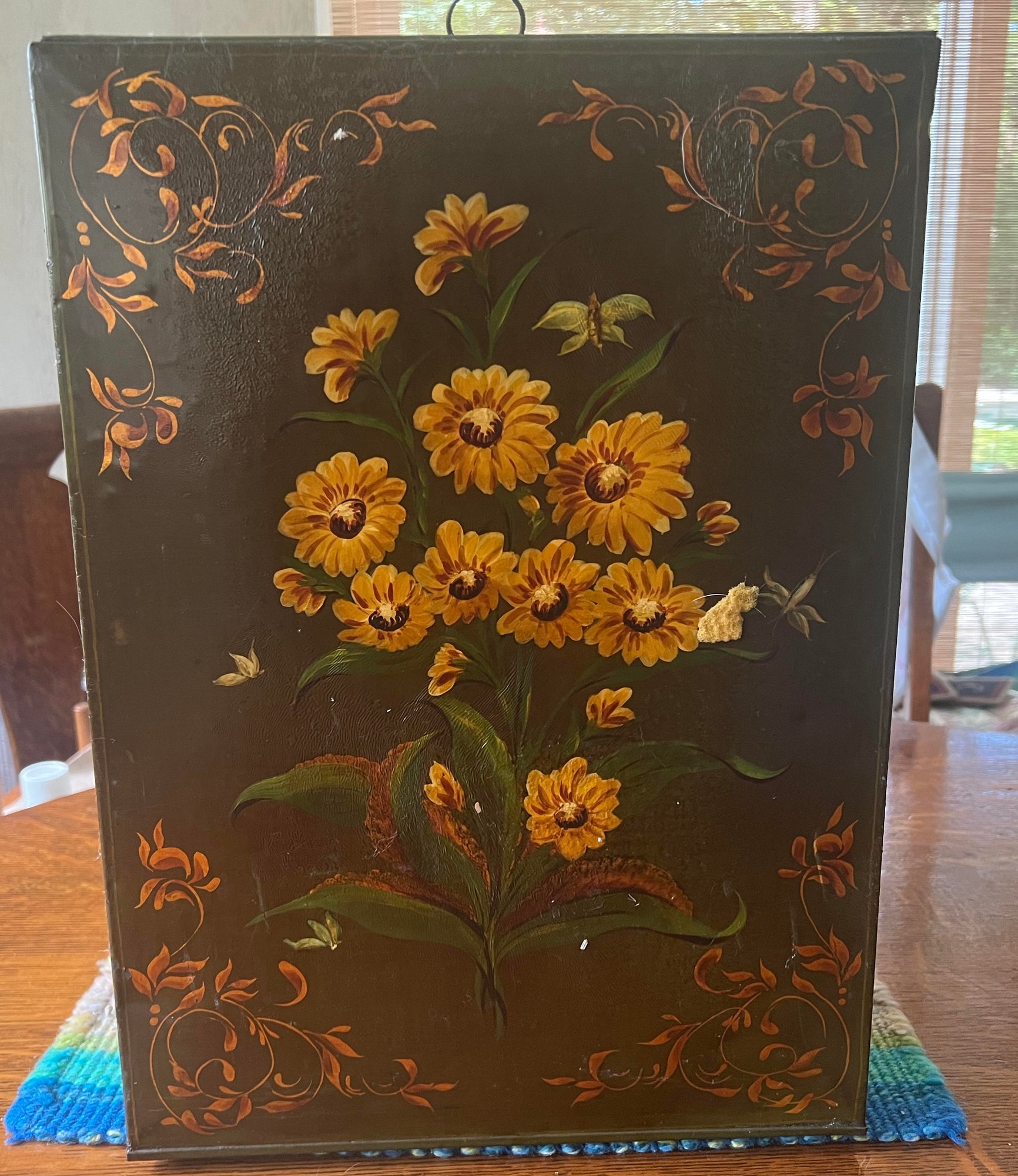 16" tall, 11.5" wide, 11.25" deep. Some bends on the top. Lid opens and closes. Some scratches.