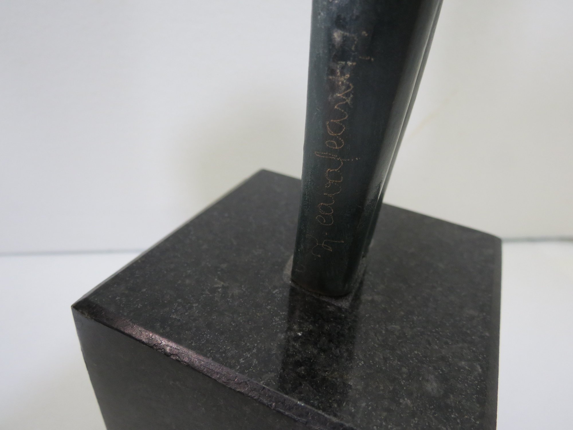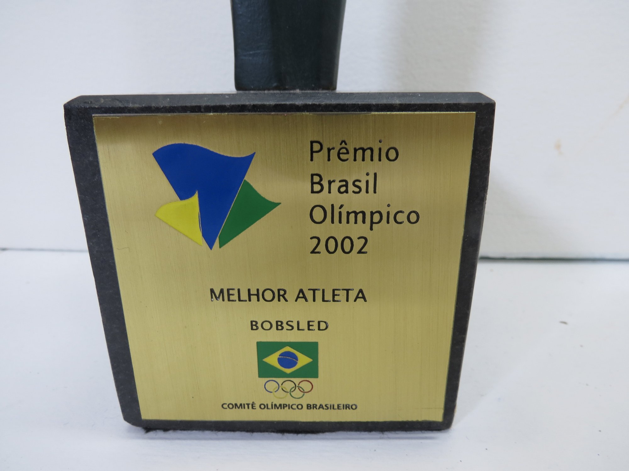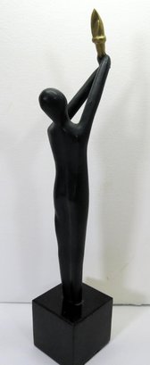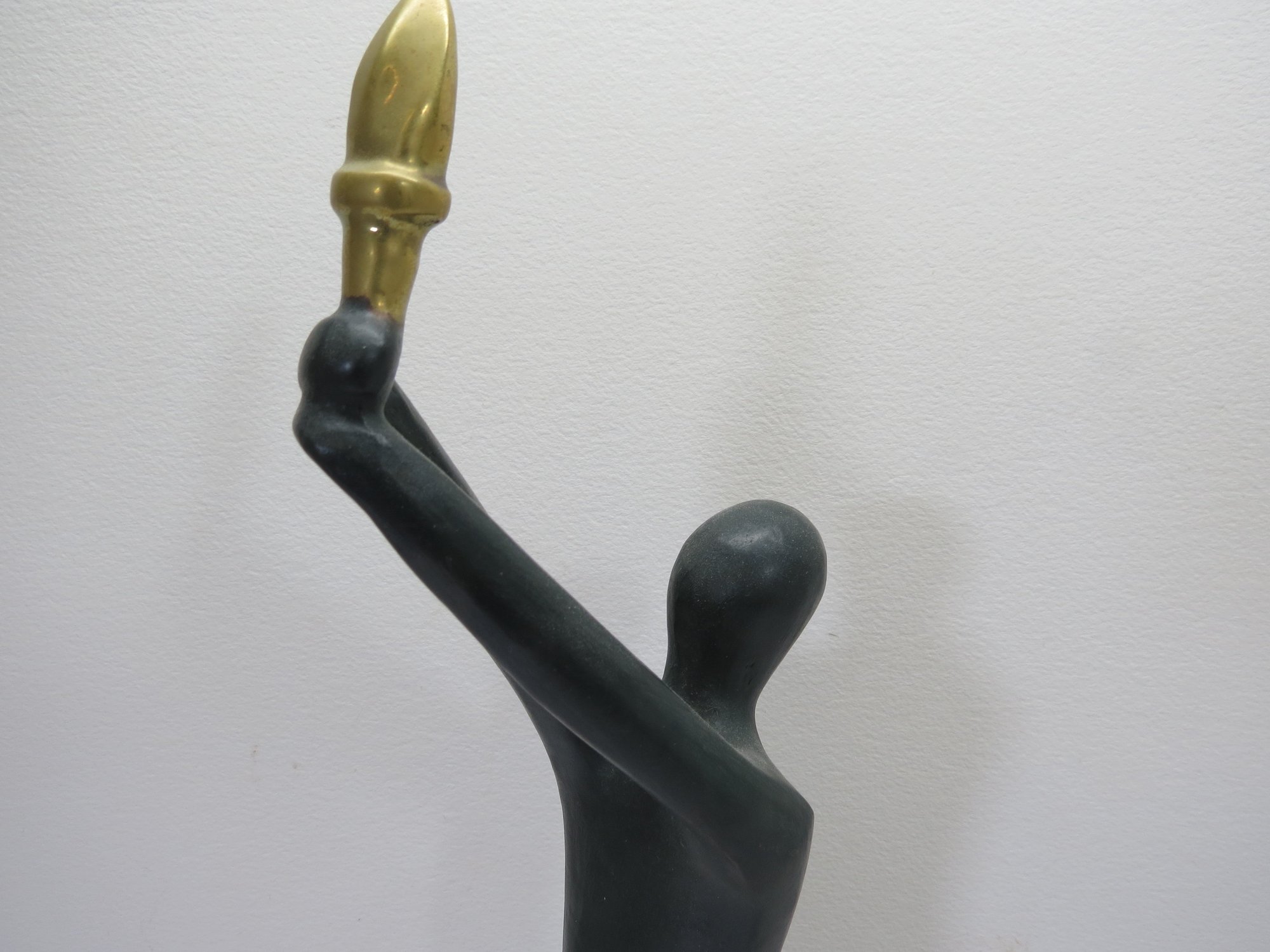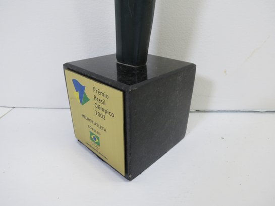 An impressive 18 inch tall bronze sculpture on granite base of a man holding up the Olympic flame. The flame being painted in gold. Brass plaque on the base features the Olympic seal and the flag of Brazil. The award itself ways a whopping 18 pounds. The name of the artist is engraved in the side of the sculpture. Very rare. The consignor wishes that the name not be public, but the name of the participant will be provided to the high bidder (he is well known and has an extensive wiki page).