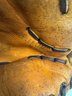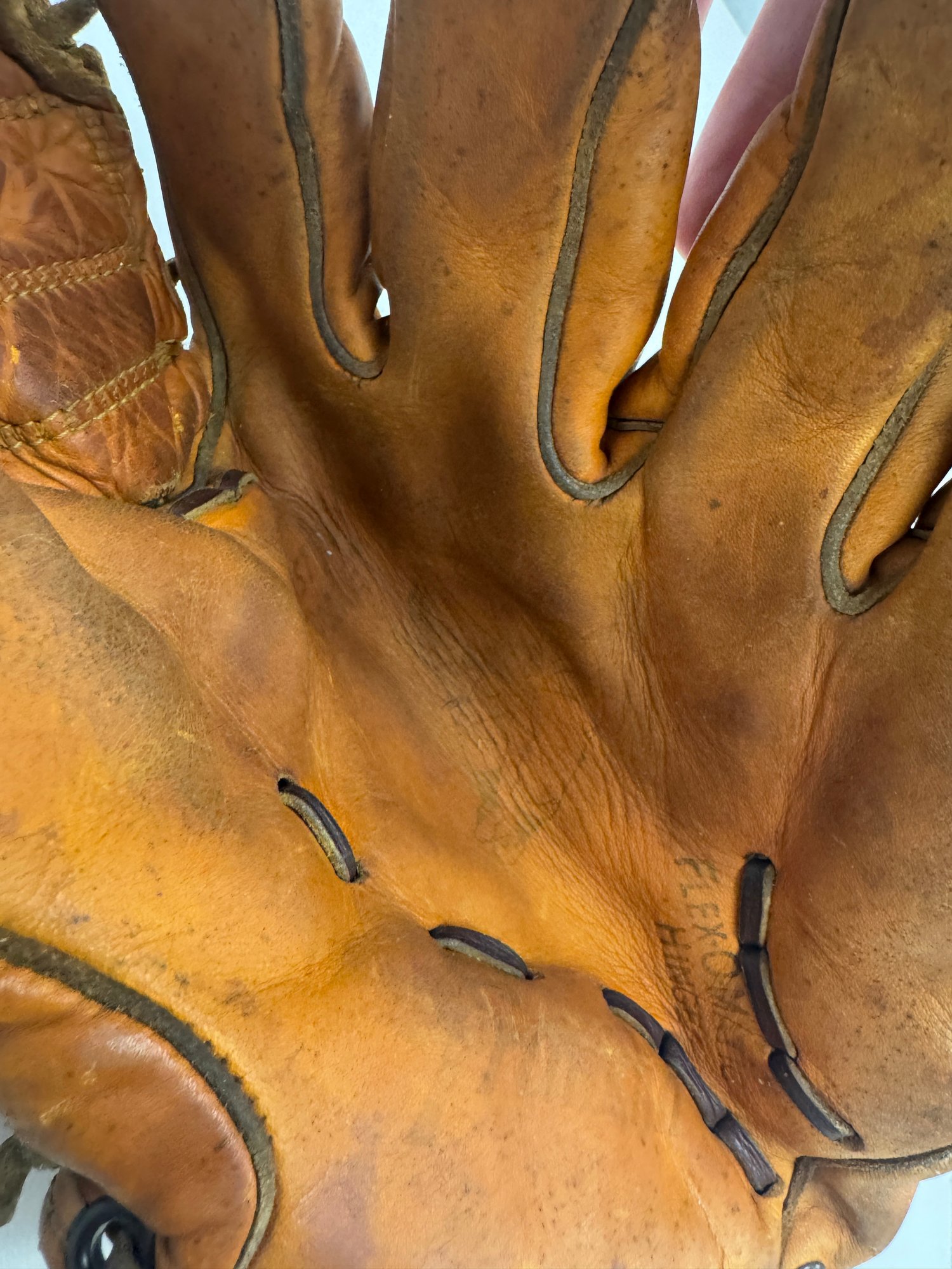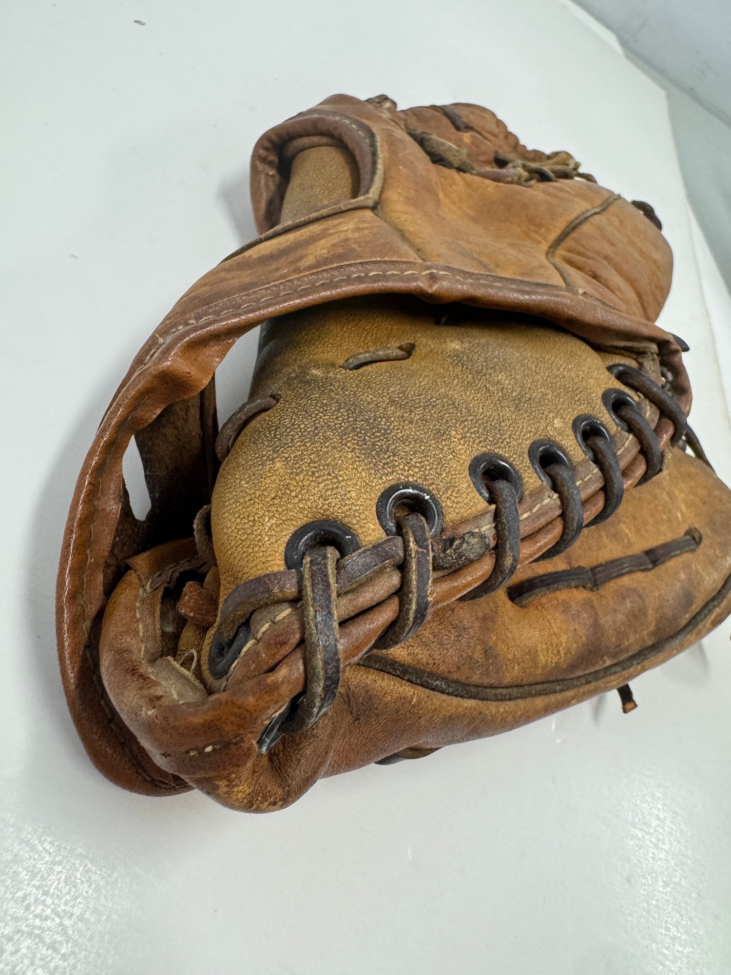 Glove is a smaller/kids vintage baseball glove engraved “Bob” Clemente. The glove is overall in good shape but a lot of the writing is fading and difficult to read. The glove measures about 10” tall and 7” wide