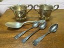 Includes sugar, creamer and (4) spoons. The large spoon is marked "Sterling". The three other spoons are only marked with the maker and appear to be coin silver (but not guaranteed). They are early-mid 19th century however.