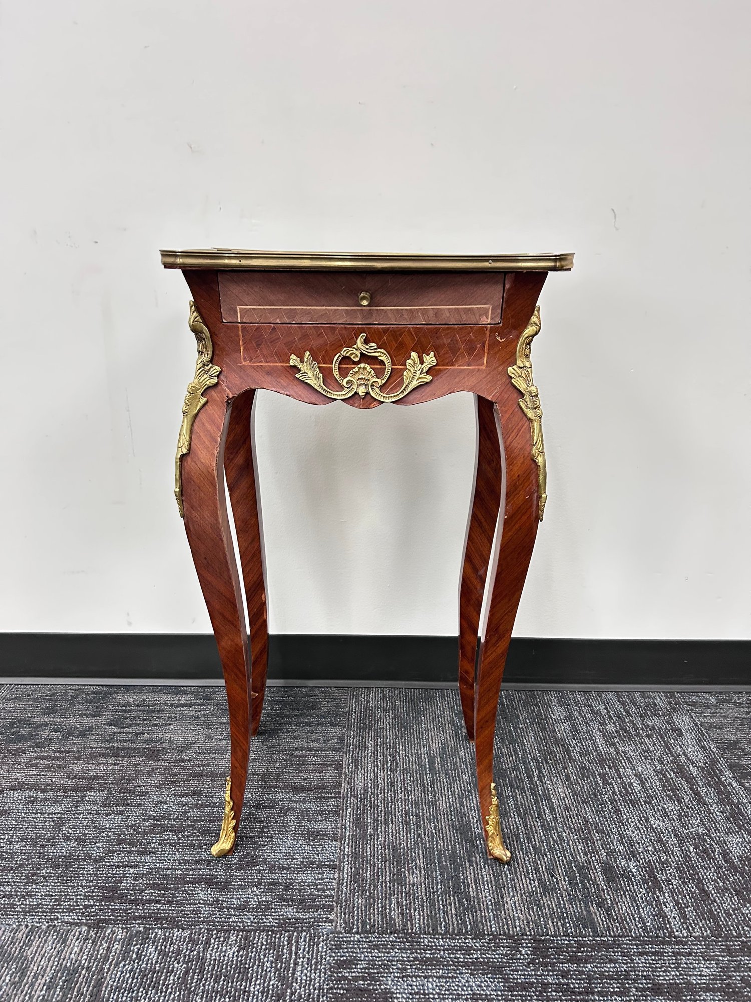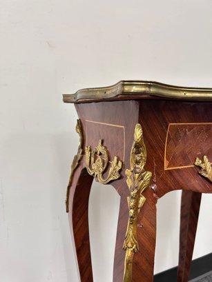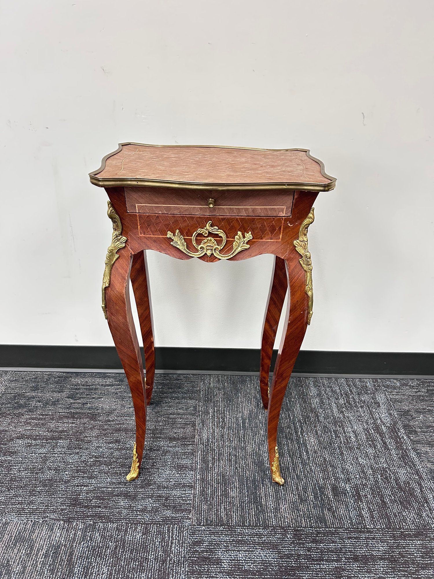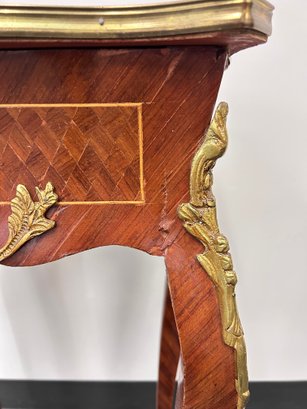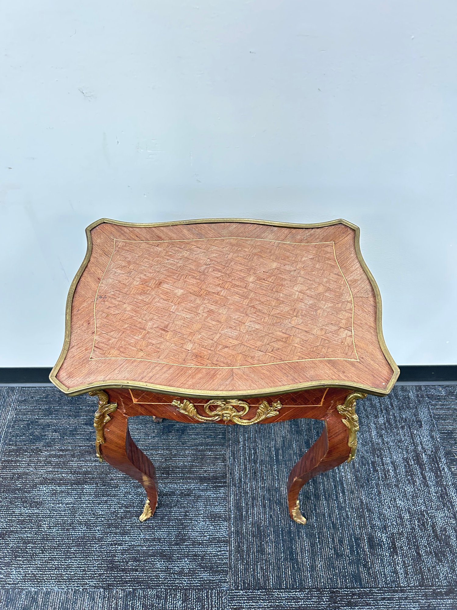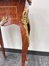 slender cabriole legs, a single drawer, ornate gilt-bronze (ormolu) mounts, and delicate wood marquetry inlay. See fading on tops and sides
