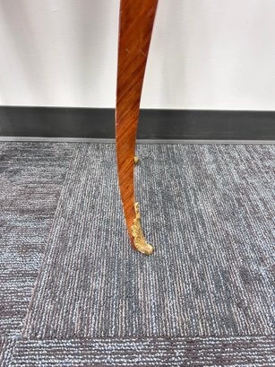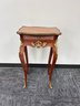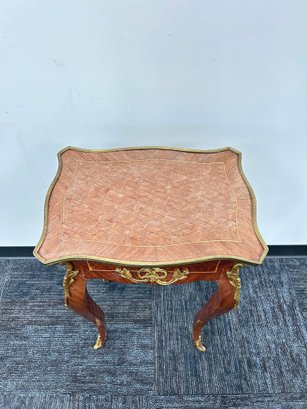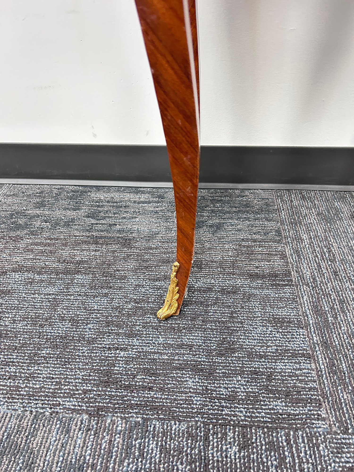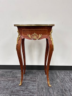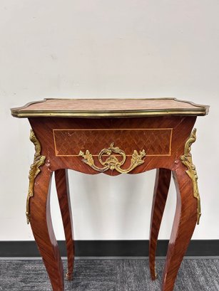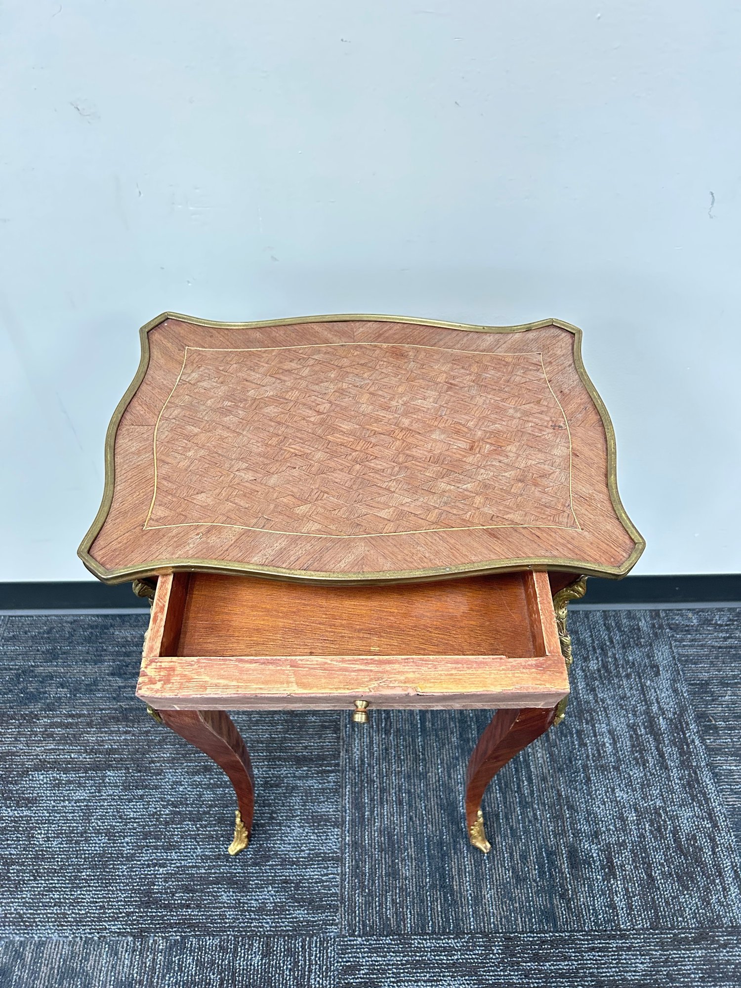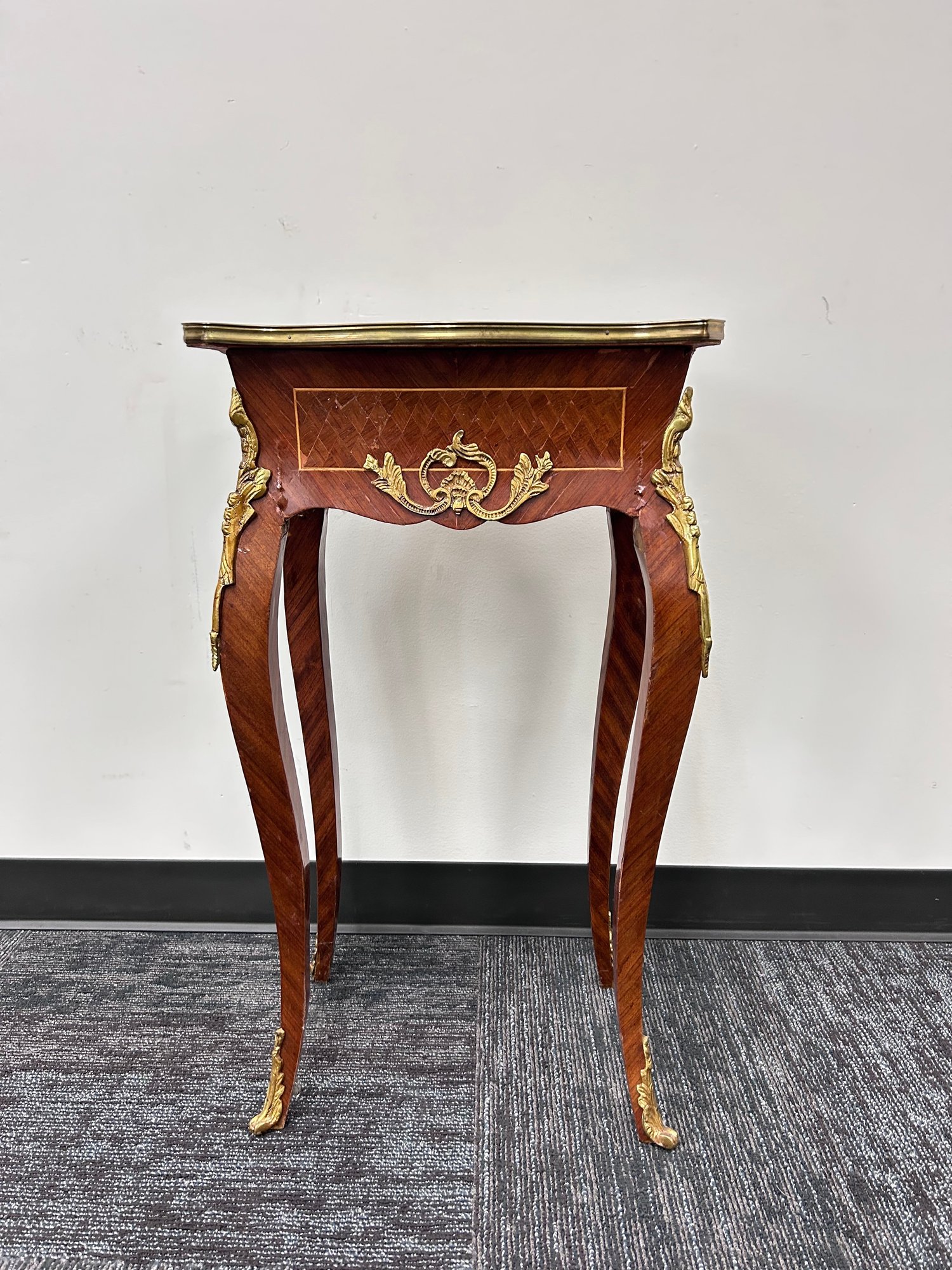 slender cabriole legs, a single drawer, ornate gilt-bronze (ormolu) mounts, and delicate wood marquetry inlay. See fading on tops and sides
