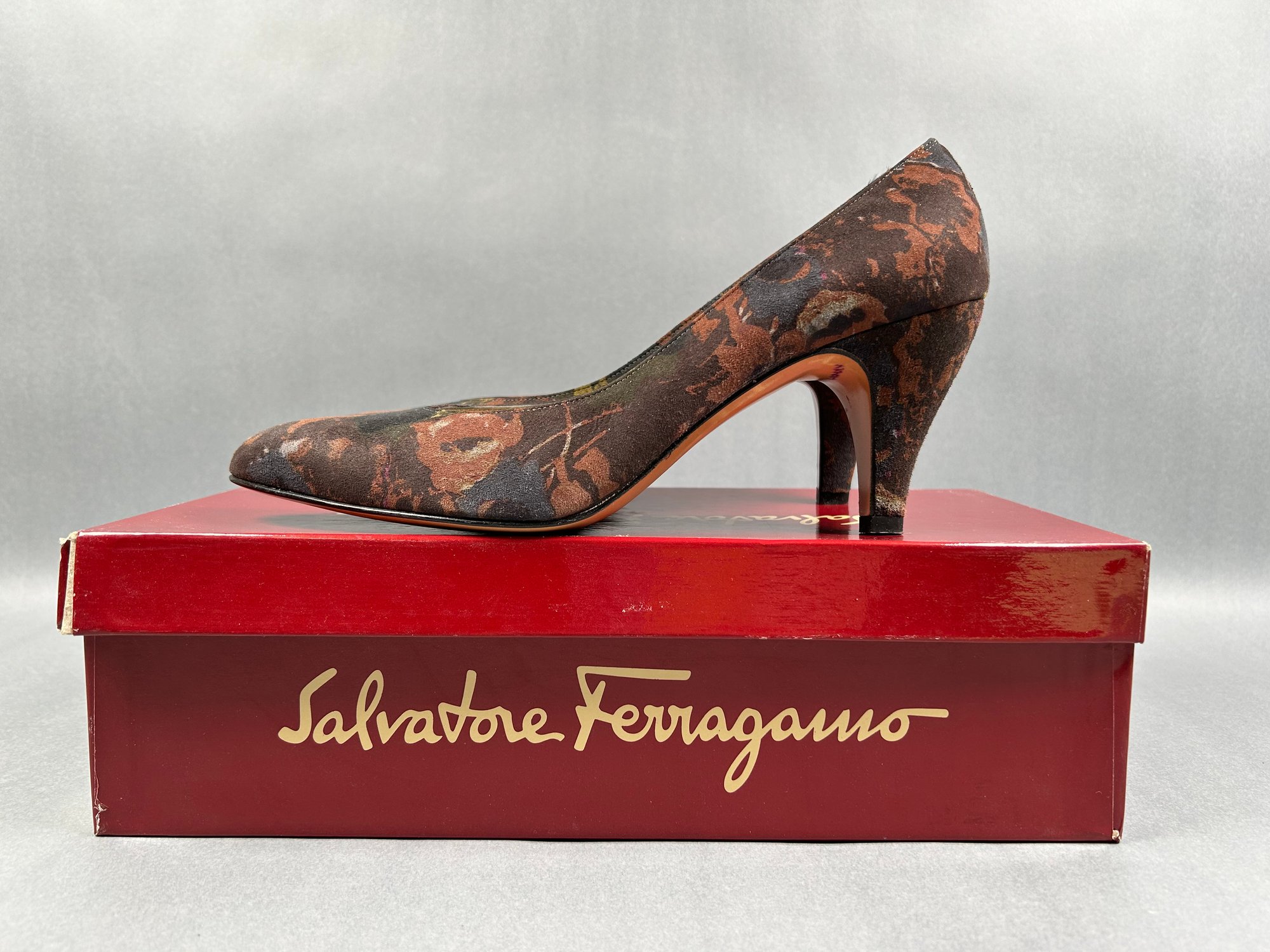 Abstract Floral Suede Ferragamo 8.5 Pumps