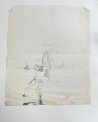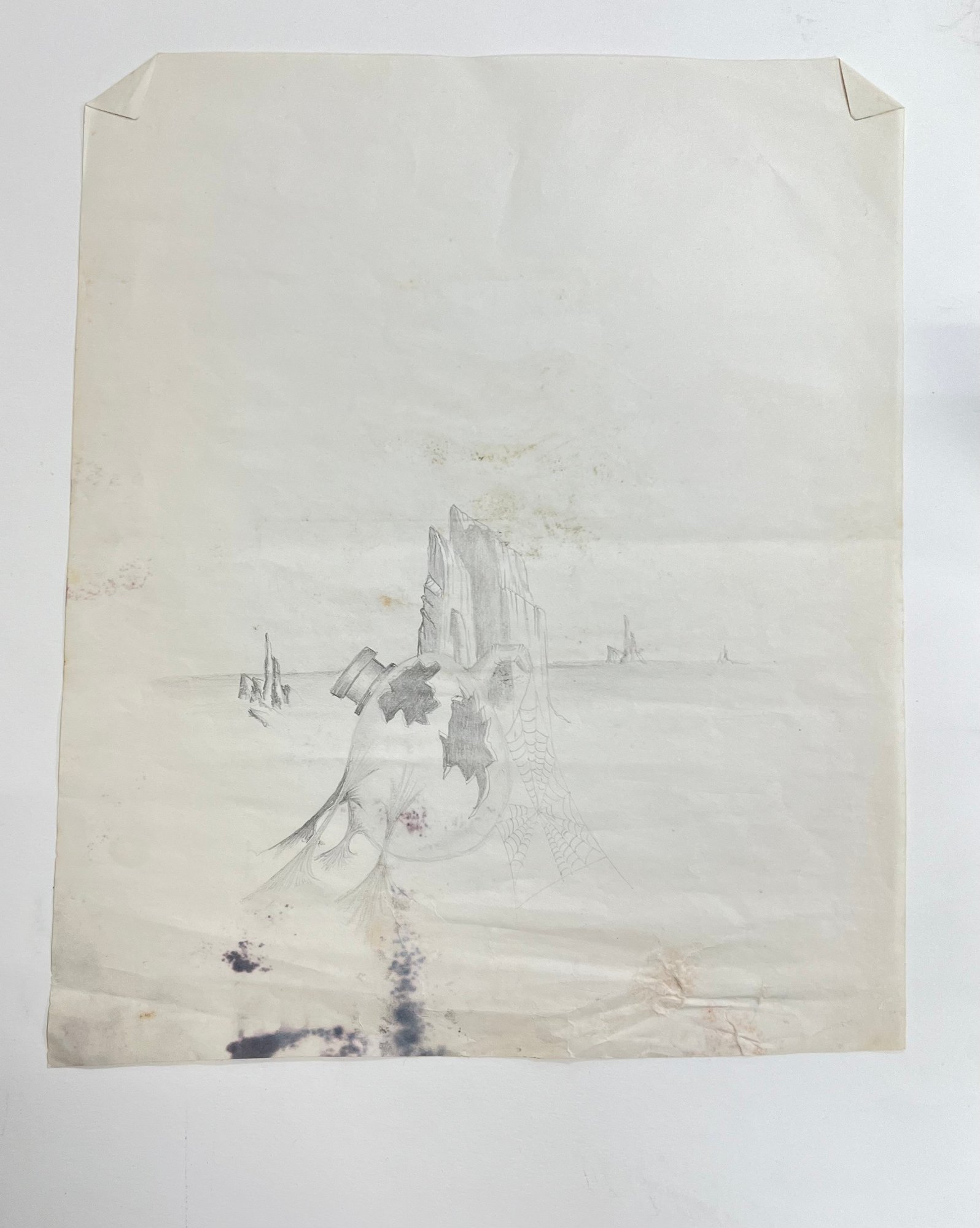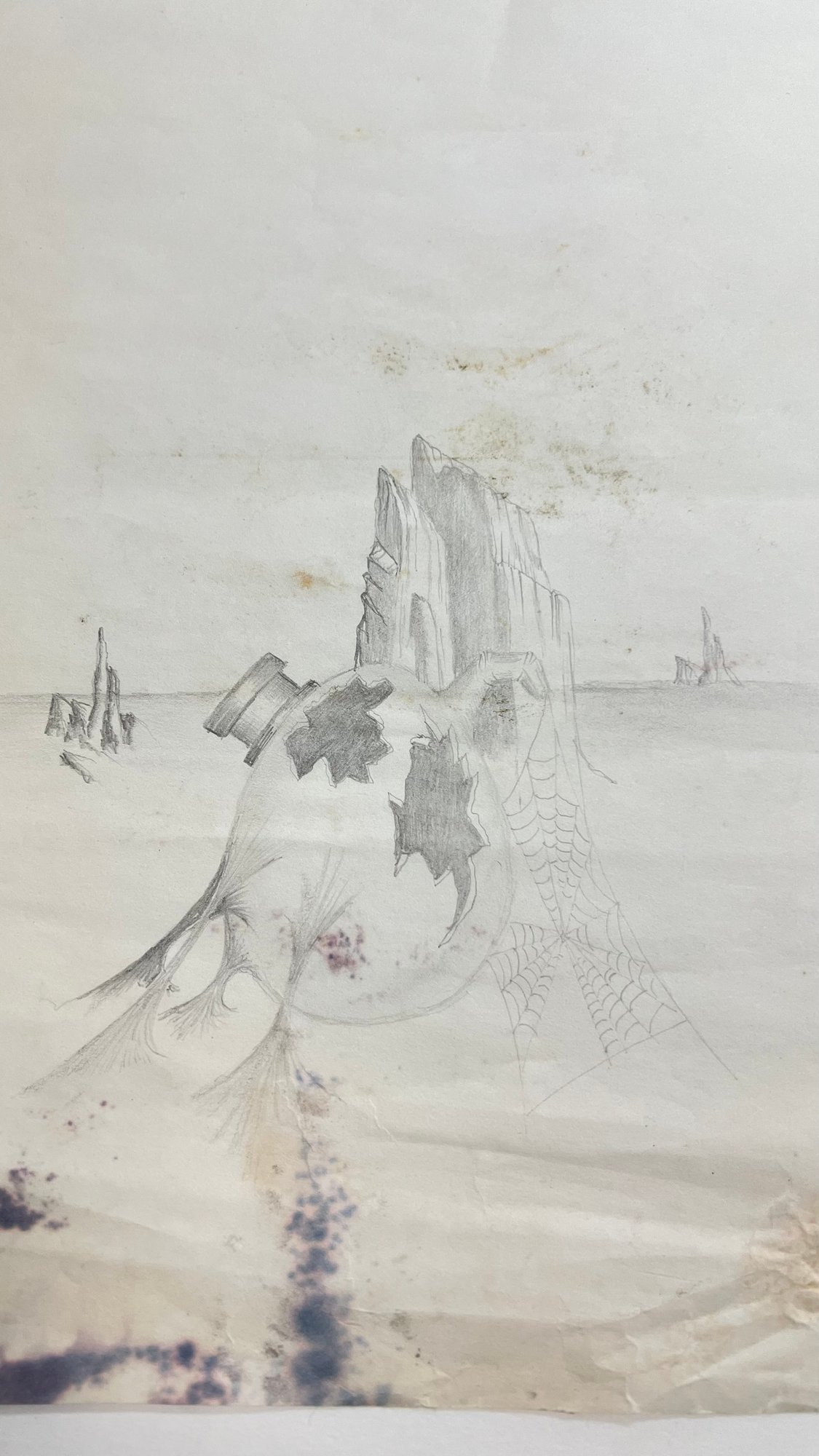 image is a pencil drawing in a surrealist style, depicting a broken, bottle-like object in a desolate landscape with rocky structures in the background Artwork resembles the dream-like, bizarre style of surrealist artists like Salvador Dalí