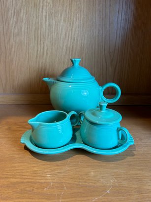 Four Fiesta Green Pieces Teapot Creamer And Sugar