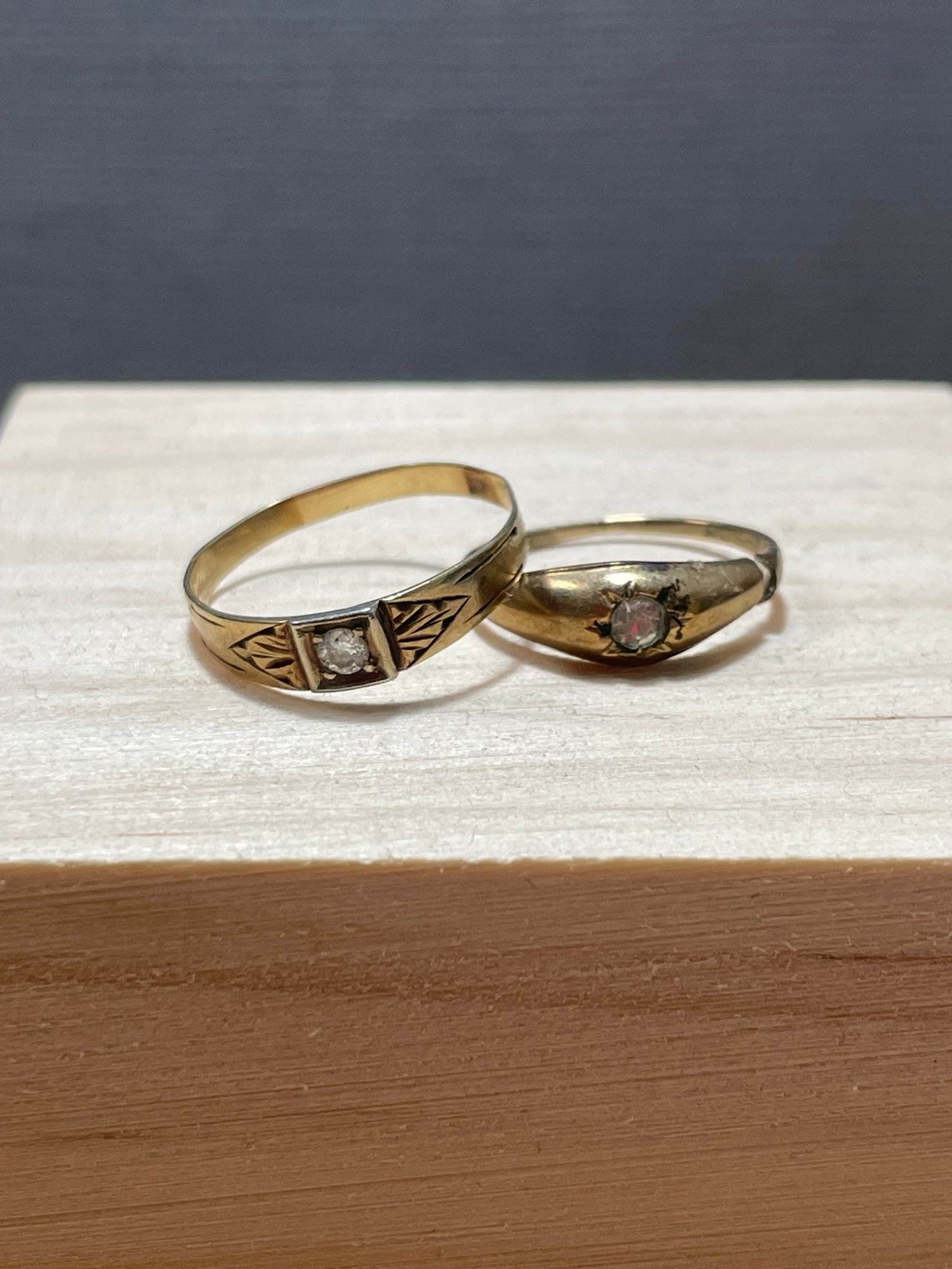 Rings very worn, one has break in band. Size 3 and size 5. Stone not tested.