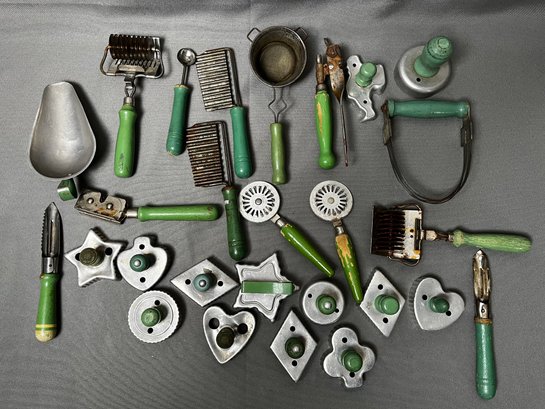 Lot Of Green Handled Kitchen Utensils.