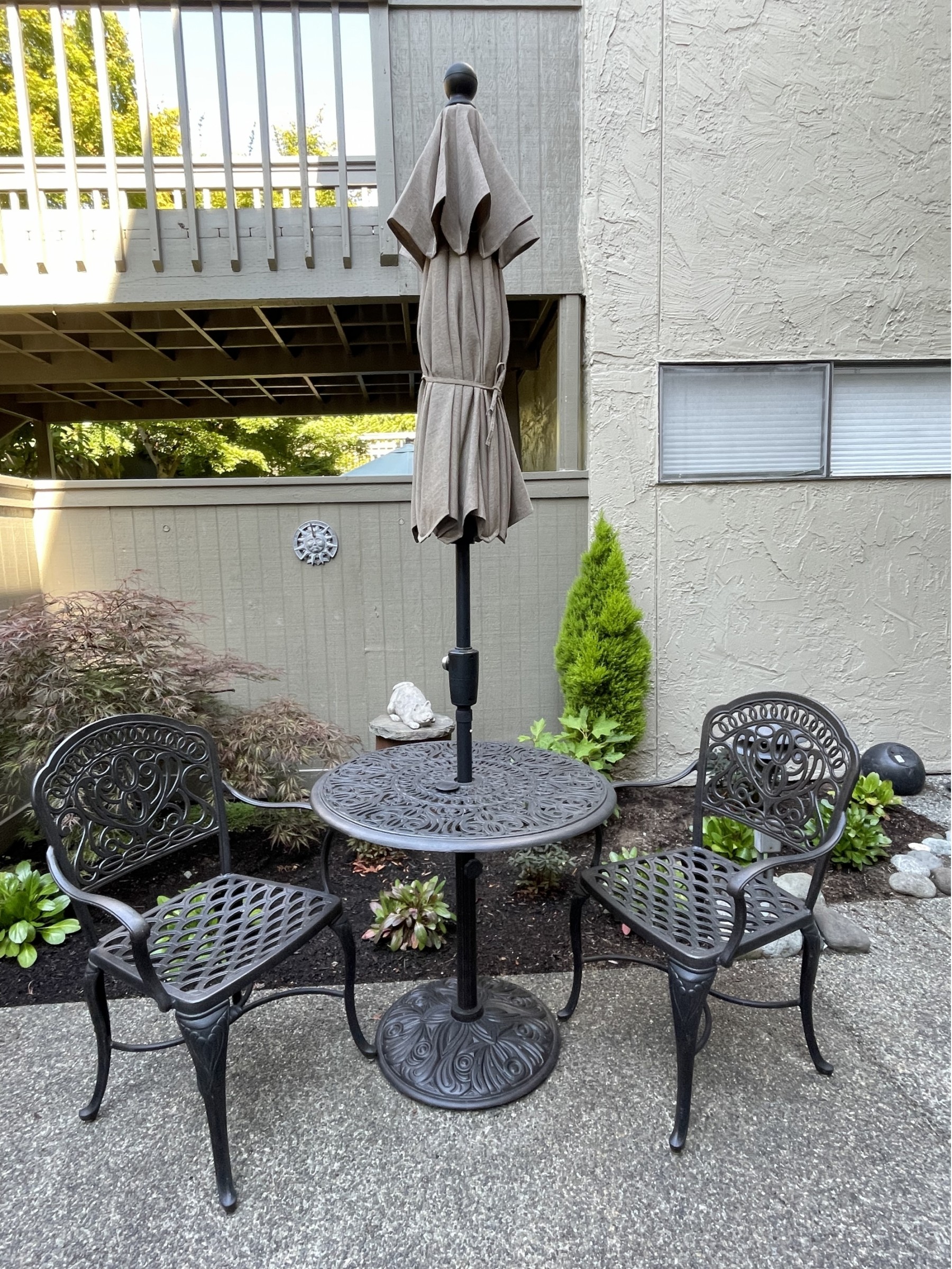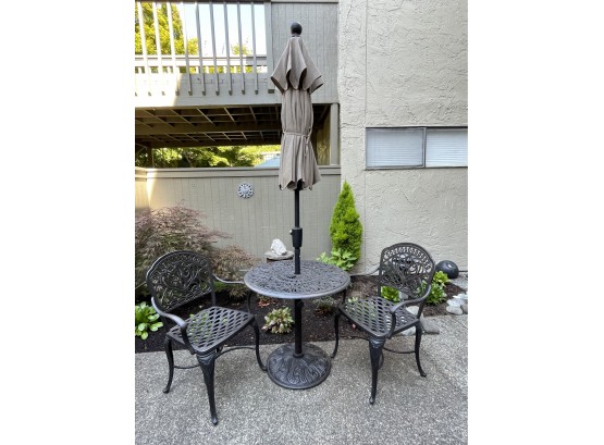 5 piece: 2 chairs, table, umbrella and umbrella stand.