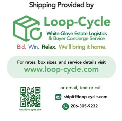 Please note the following important information regarding shipping and identification requirements for all winning bidders. **Identification and Shipping Address:** * All winning bidders are required to provide identification. The shipping address must match the address on your credit card and ID. If these do not match, we will be unable to release your items for shipping. Please ensure your shipping information is updated before placing any bids. No In-house shipping effective October 13, 2025. We have outsourced to Loop-cycle.com LoopCycle handles all of our auction shipping! Here’s what you need to know: 1. Flat Rate Box Pricing Posted Online *Flat-Rate Simplicity: Each box ships at a flat handling fee of $15 for first-time customers and is now $7.50 for repeat buyers. *USPS Small Flat Rate boxes will ship at Base Fee + discounted USPS postage (typically around $9.60). *If you win multiple lots, we’ll combine them whenever possible to save you money. *Bulky or Fragile Items: For larger or fragile pieces, just contact LoopCycle directly for a quick quote before you bid. Stress-Free Shipping: Once you’ve won, LoopCycle handles pickup, packing, and delivery coordination. It’s like having a personal concierge for your auction treasures! 2. Standard Box Pricing Posted Online. The website now lists a simplified set of standard Small, Medium, and Large box sizes with pricing, so buyers can easily estimate shipping costs before bidding — without needing to request a quote. 3. New Online Quick Estimate Request Form. We’ve added a simple form that allows buyers to request an estimate directly from the website while browsing, particularly for lots that fall outside standard box sizes or require extra-fragile packing. For rates, box sizes and service details visit www.Loop-cycle.com. We cannot release your order until we have received both the signed invoice and, if applicable, a copy of your ID.* **Bid Retractions:** Bids cannot be retracted, canceled, or rescinded due to shipping issues, including costs or prohibitions. Bidders are responsible for considering all shipping costs before placing a bid.* **Liability:** GES is not responsible for loss or damage of purchased items handled or shipped, nor for actions or omissions by third-party shippers (whether recommended by GES or not).* **Private Residence Pickups:** Please be aware that some auctions will have pickups at private residences, and this will be clearly stated in the auction details. **No shipping is available for these items.***International Regulations:** Buyers must be aware of local regulations regarding the shipping or receipt of items such as ivory, taxidermy, and firearms. GES will not alter packing slips, lot descriptions, or prices paid. If items are seized by customs, GES is not liable for costs or refunds. If you are unsure about local rules and regulations, please do not bid on items that may violate those regulations.