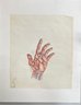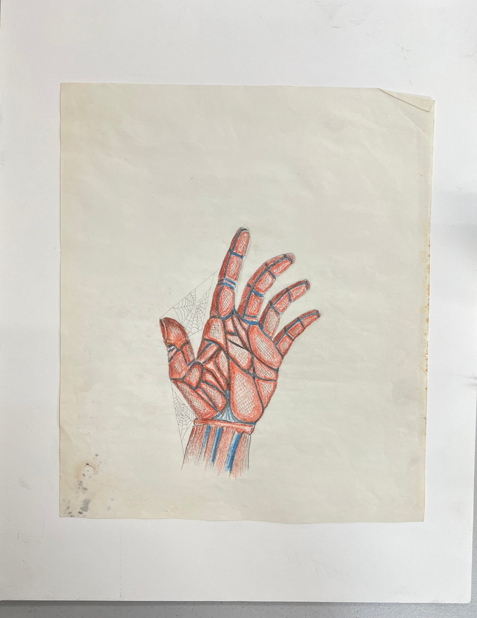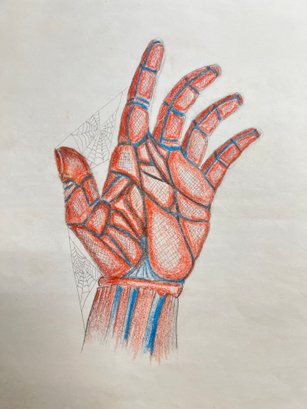 stylized artwork of a human hand featuring red and blue colored sections that resemble a structural or anatomical view, along with spiderweb designs on the left side.