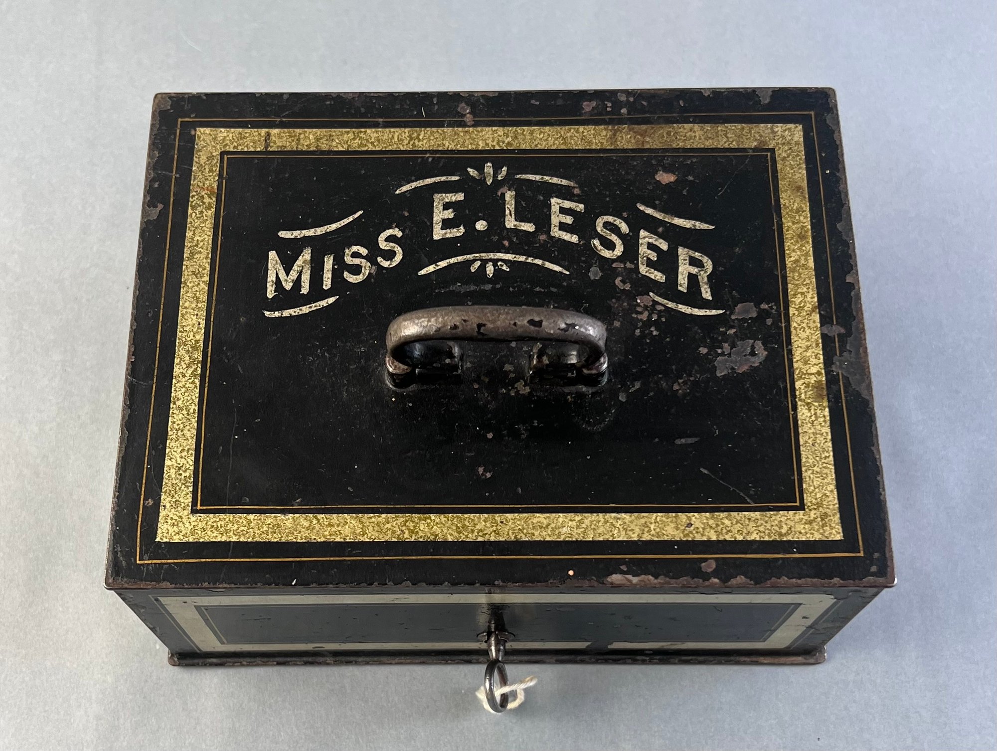 black metal box with gold trim and the name "MISS E. LESER" painted on the top, along with a handle and a keyhole. Key actually locks metal box