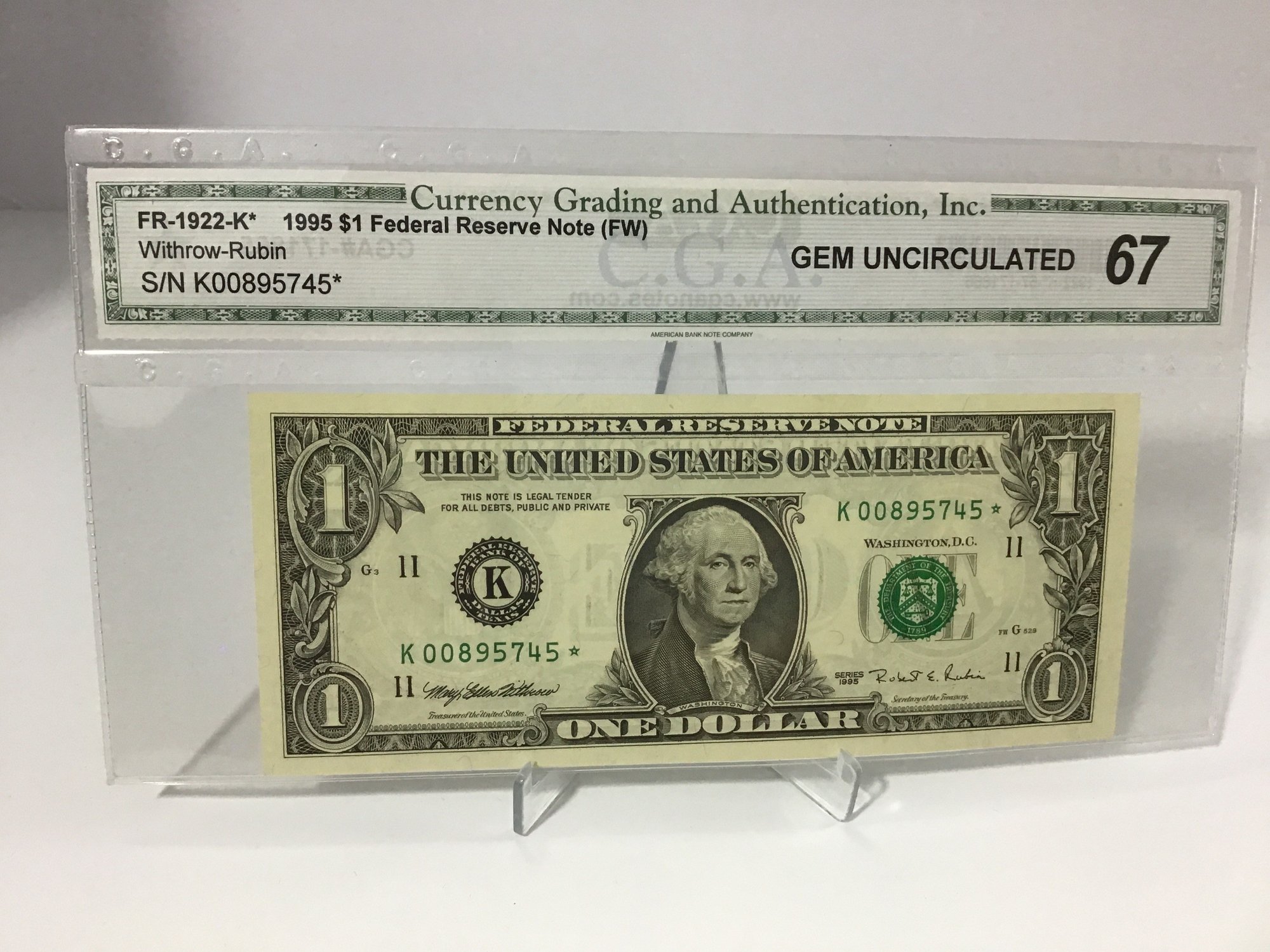 1995 CGA Gem Uncirculated 67 $1 Bill Star Note