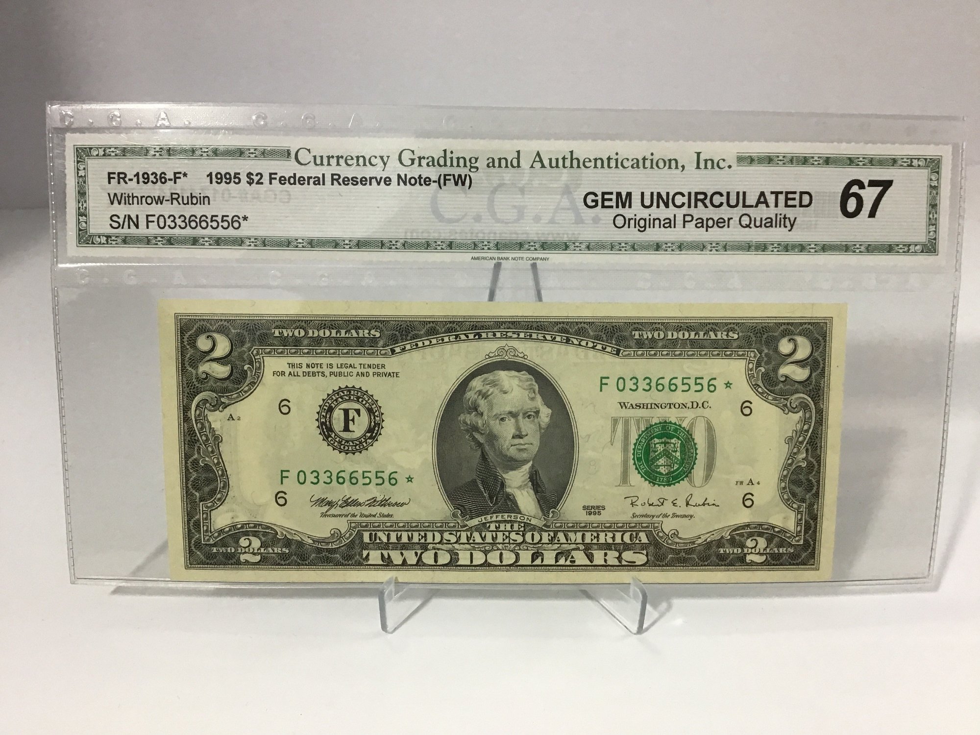 1995 CGA Gem Uncirculated 67 $2 Bill Star Note