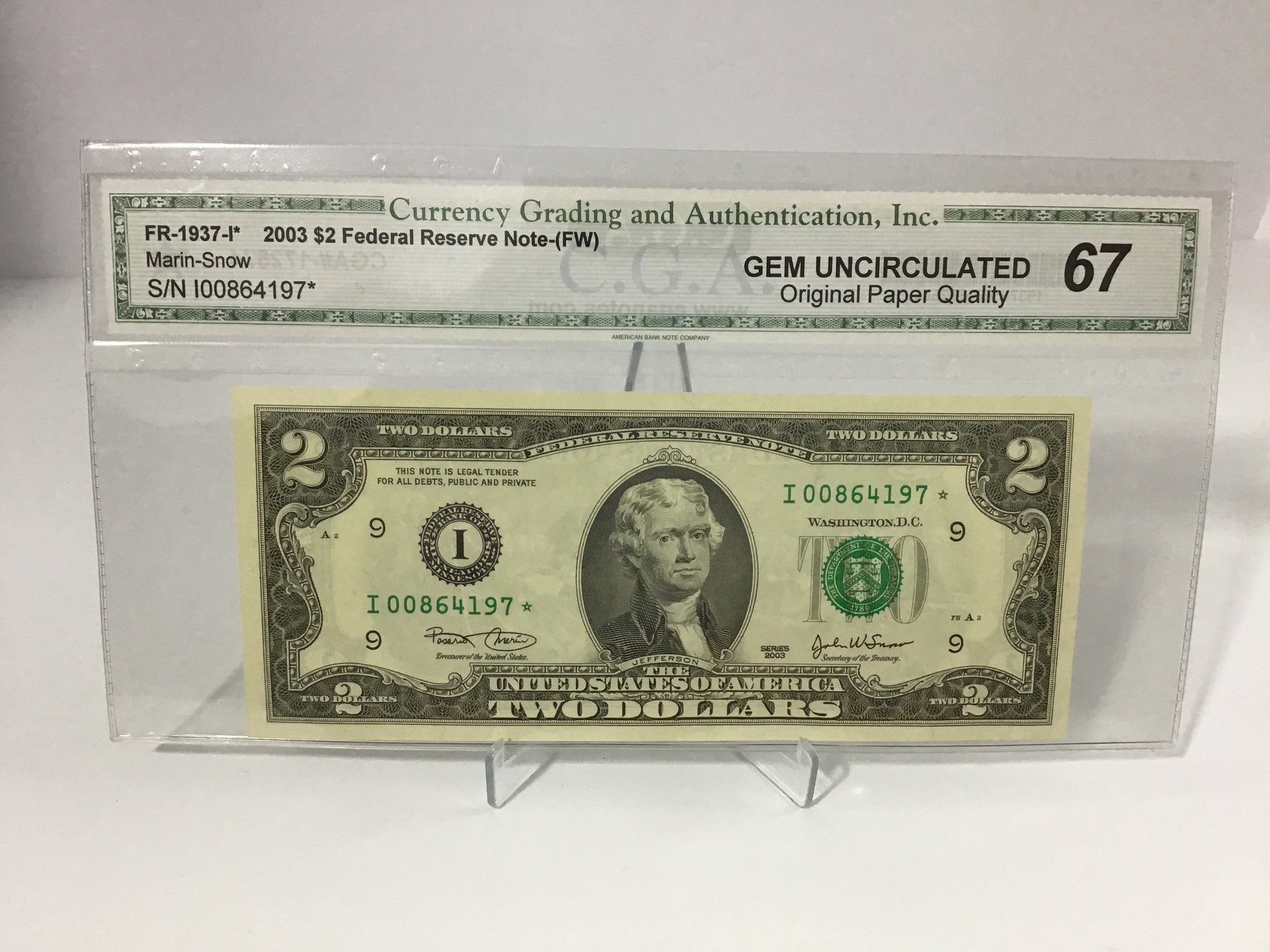 2003 CGA Gem Uncirculated 67 $2 Bill Star Note