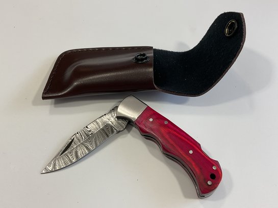 New Damascus Folding Knife W/ Sheath
