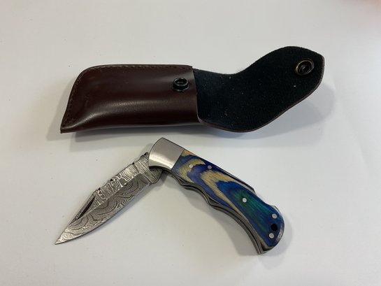 New Damascus Folding Knife W/ Sheath