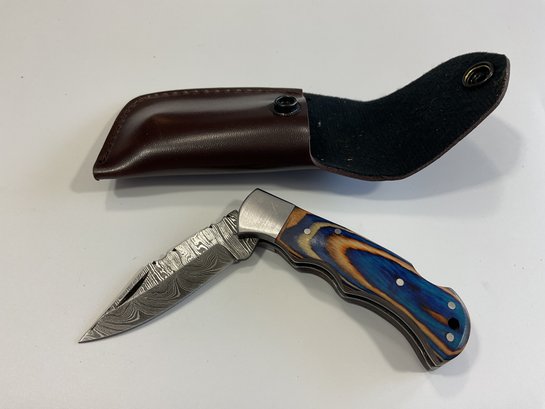 New Damascus Folding Knife W/ Sheath