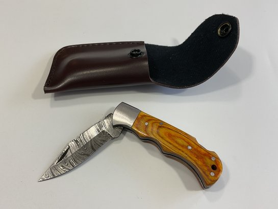 New Damascus Folding Knife W/ Sheath