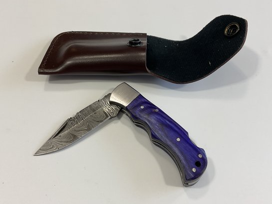 New Damascus Folding Knife W/ Sheath