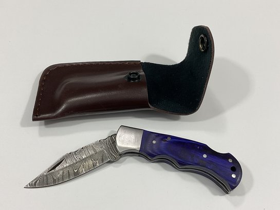 New Damascus Folding Knife W/ Sheath