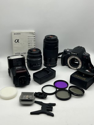 Sony A330 DSLR Camera, WORKS GREAT, 2 Lenses, 1 Battery & Charger, Detachable Flash, W/ Bag Accessories