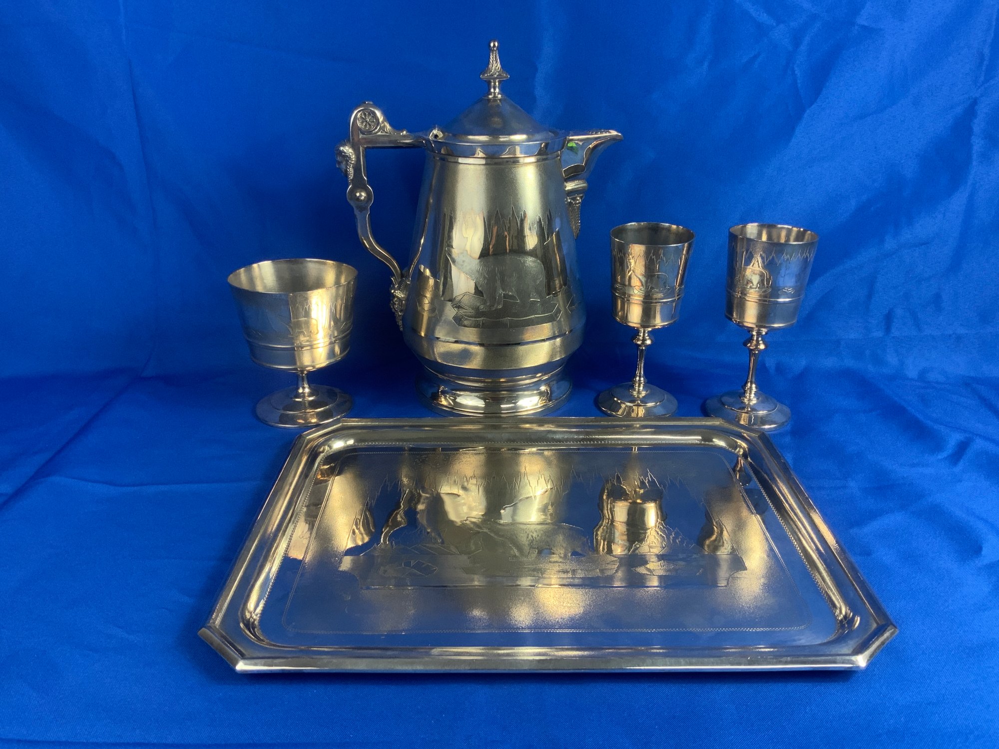 This has a large water pitcher with etched polar bears and a figural head handle also a presentation monogramed on the front dated 1873 (13.5” tall) there is a dent on one side