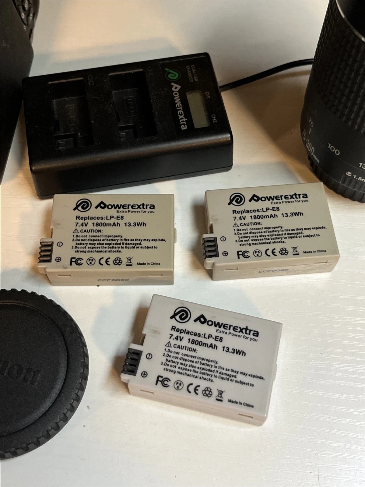 Comes with Canon EOS Rebel T4i, canon efs 18-55mm lens, canon 75-300mm lens, 3 batteries, charger, and usb charging cord, lens caps.