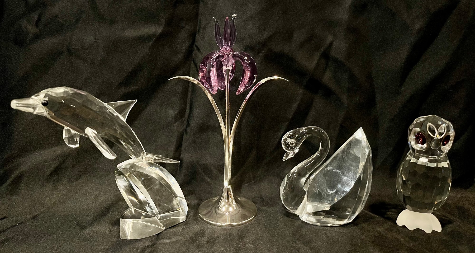 Crystal flower with metal stand is marked Godinger on bottom, owl does not have a mark, swan and dolphin both have Shannon crystal sticker on them