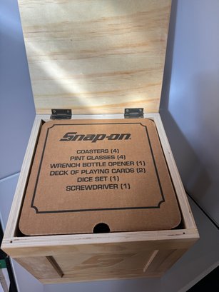 coasters, 4 pint glasses, bottle opener, cards , dice, screwdriver