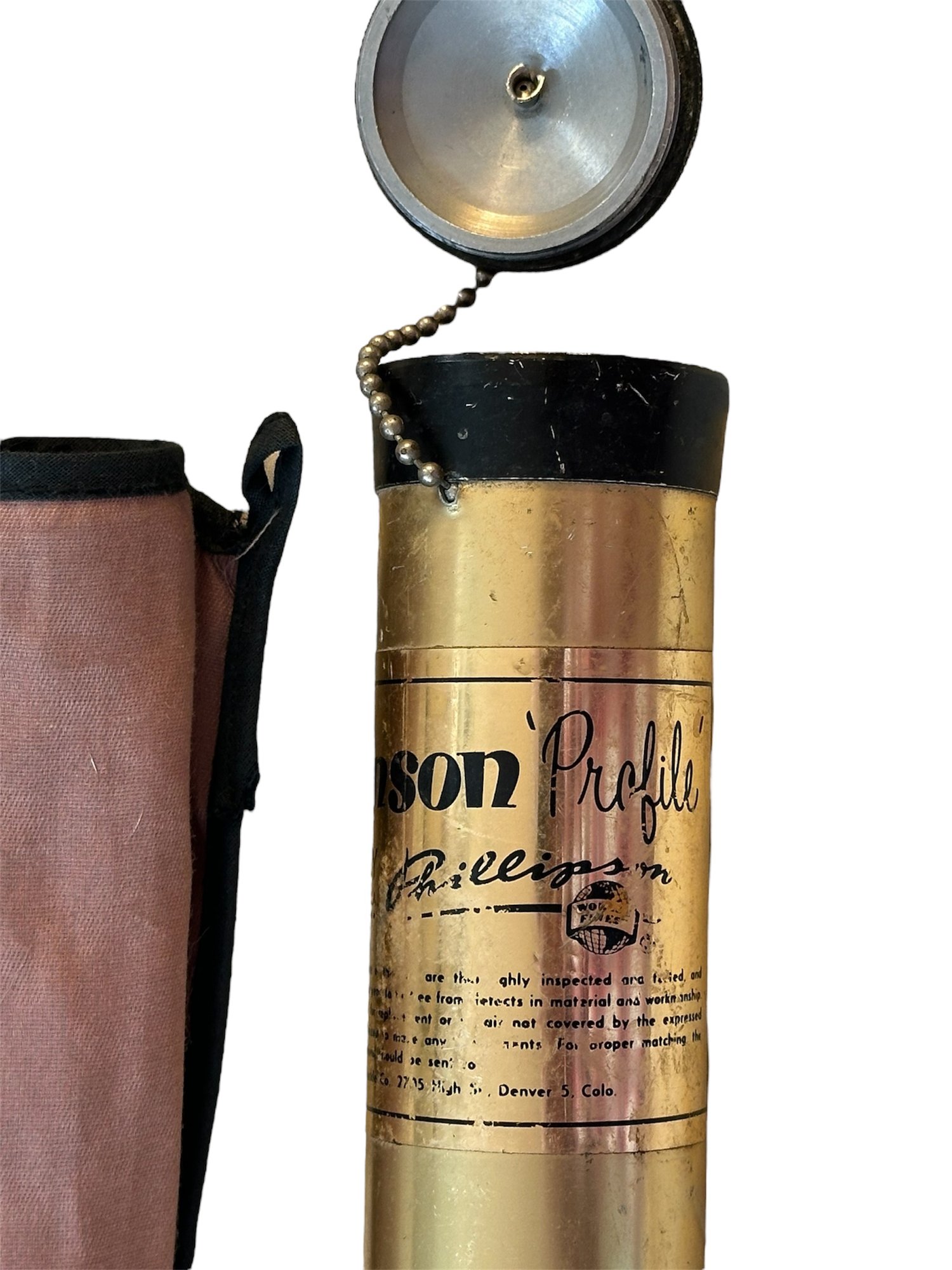 Vintage Johnson "Phillipson" profile series 800 Fly Rod 6'4", 2 pc fiberglass with felt sock and screw top aluminum storage tube
