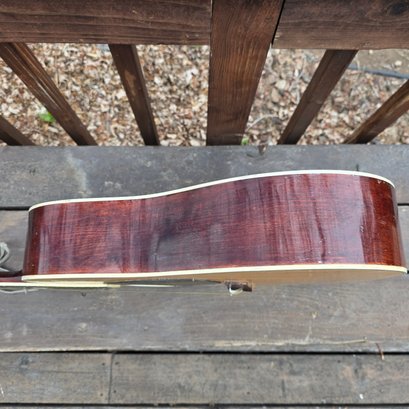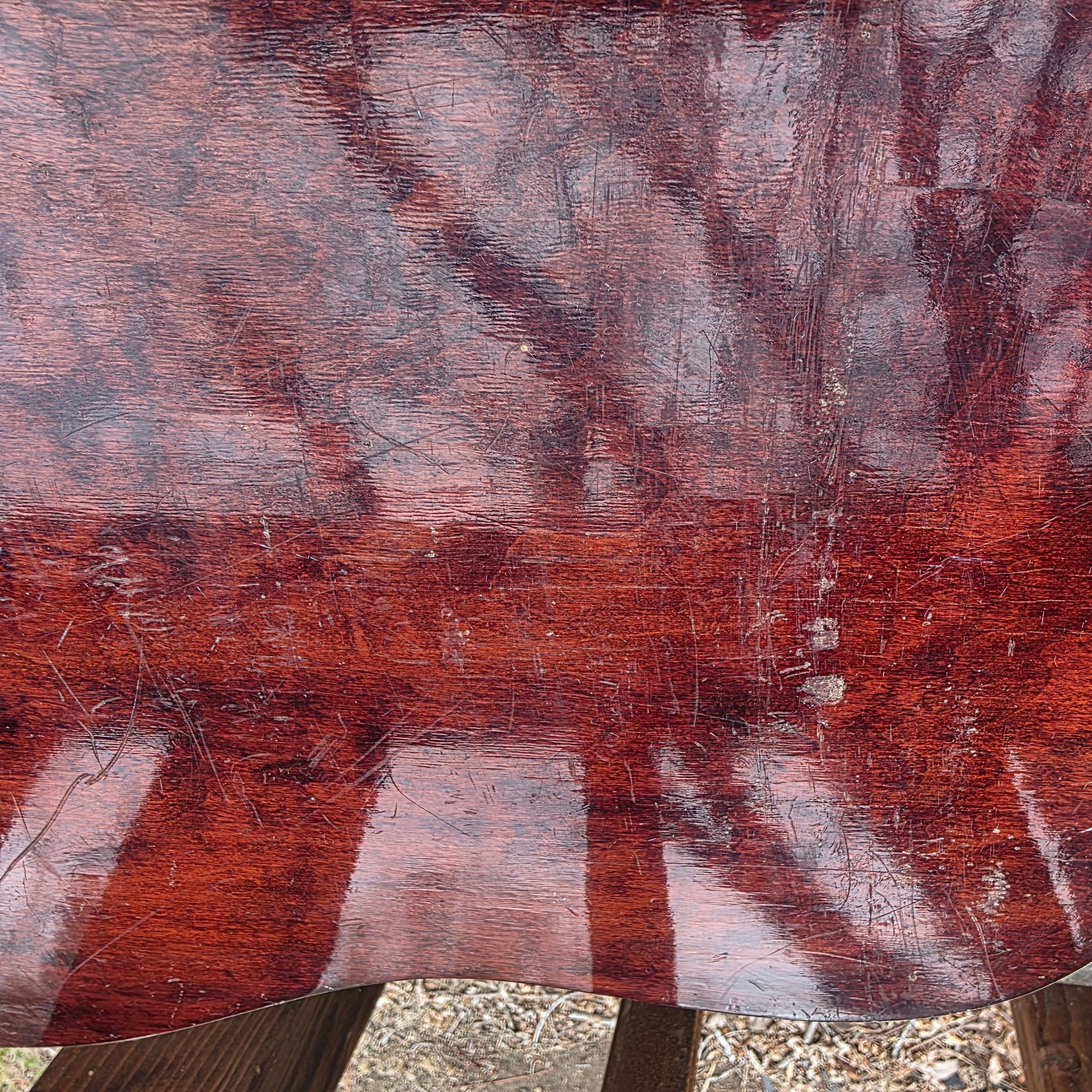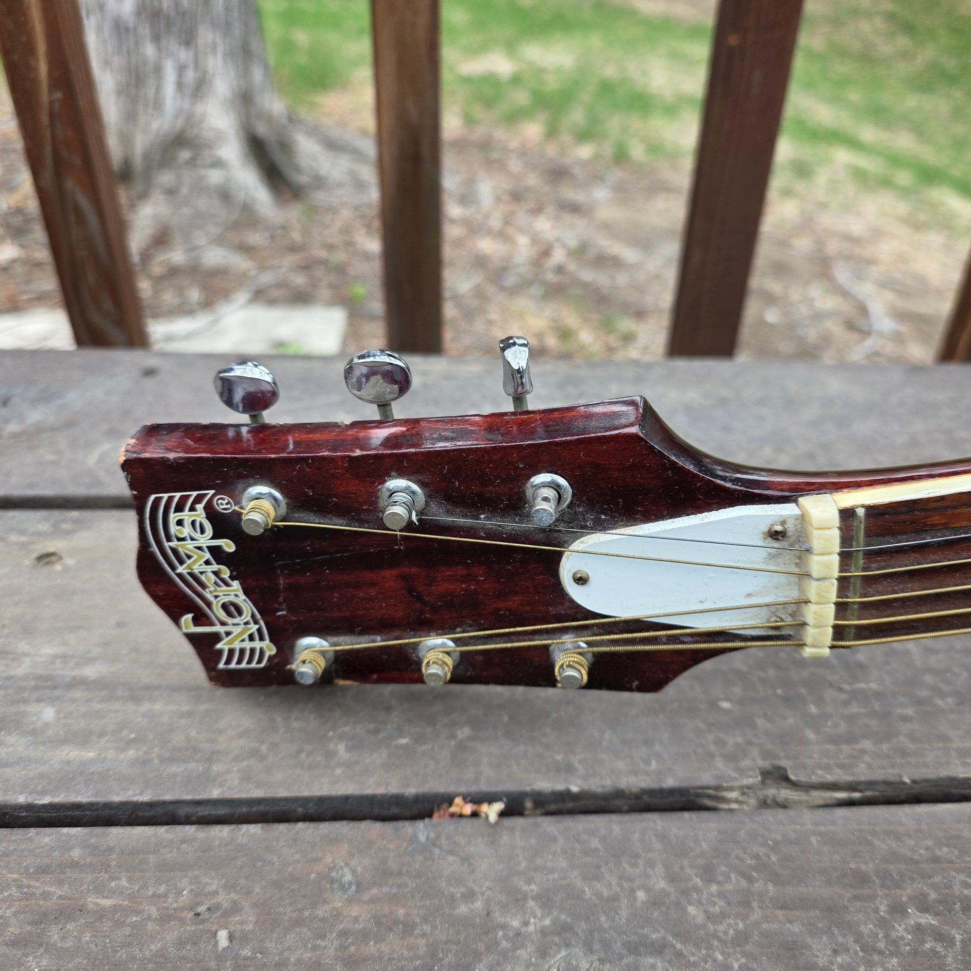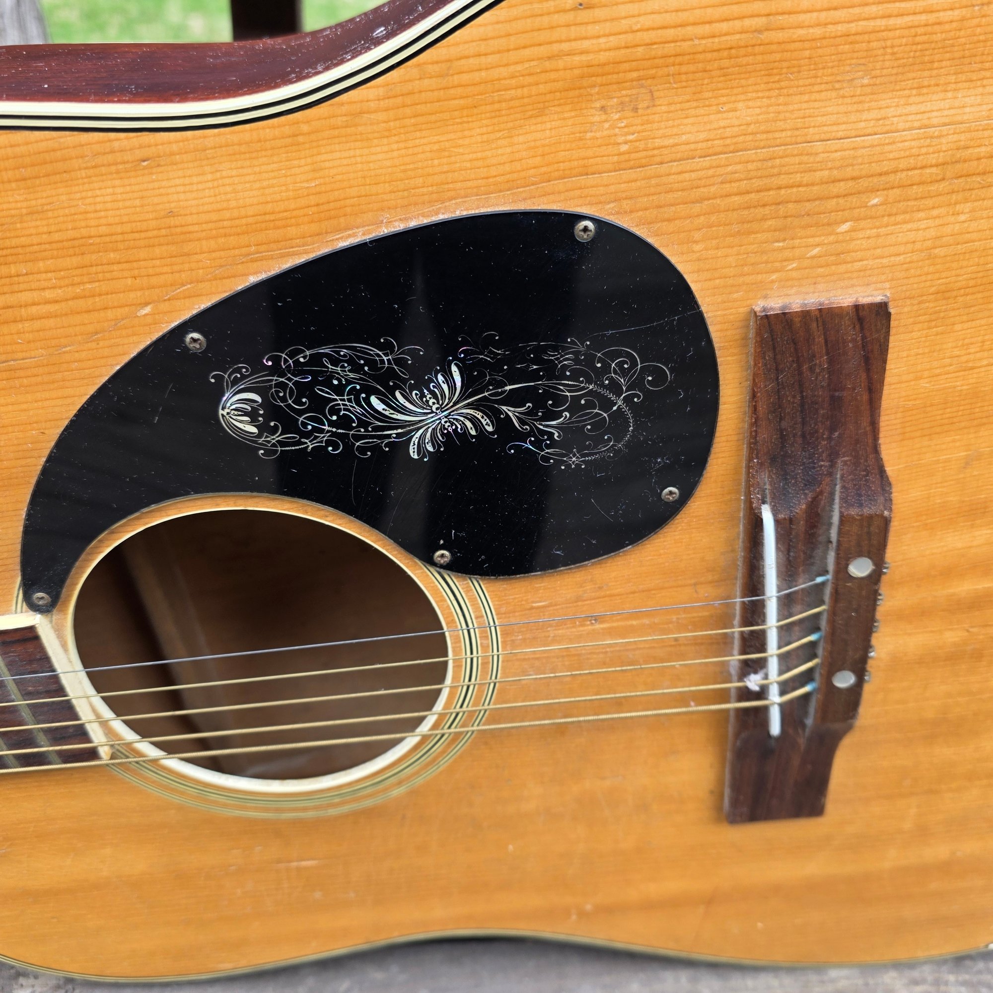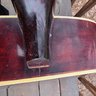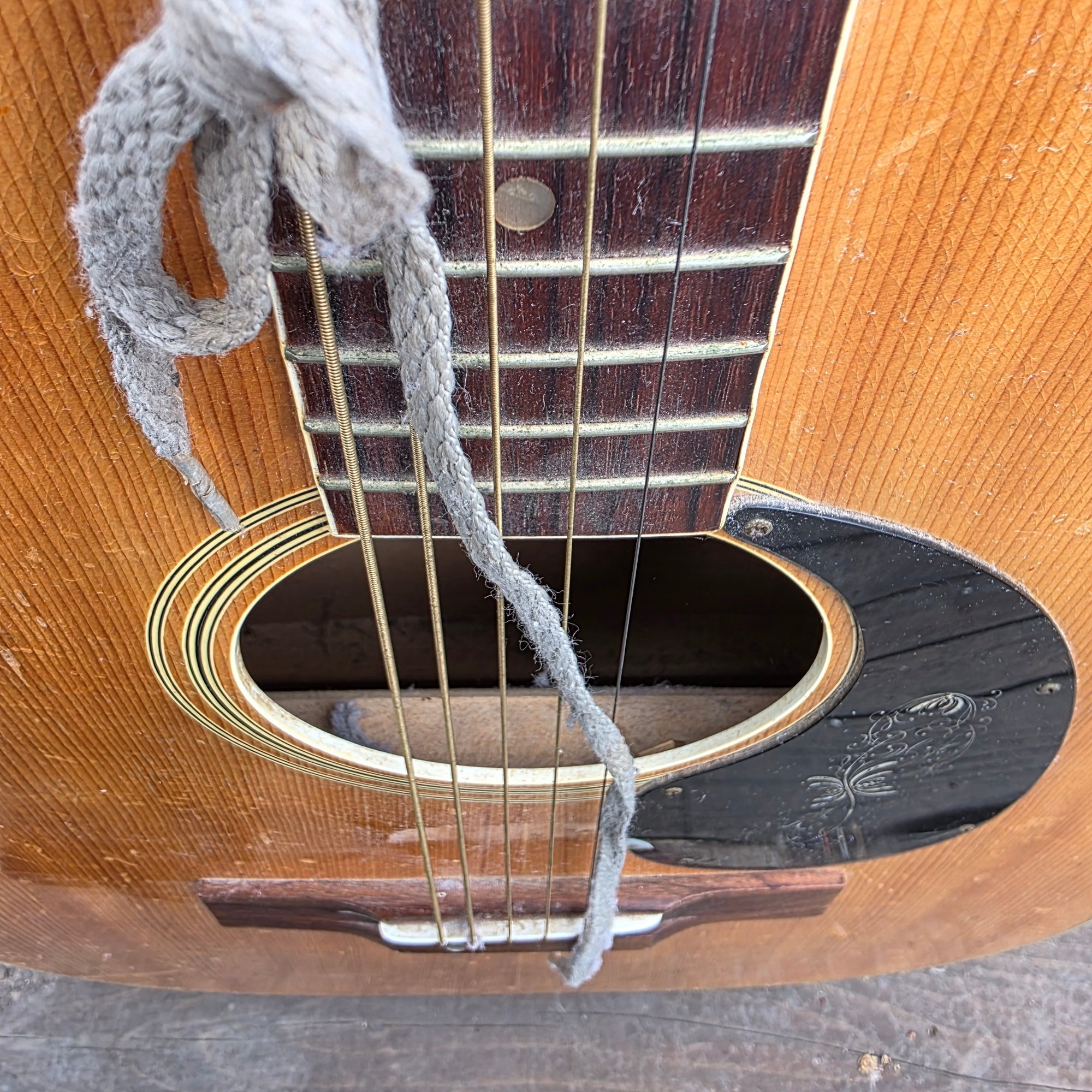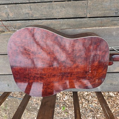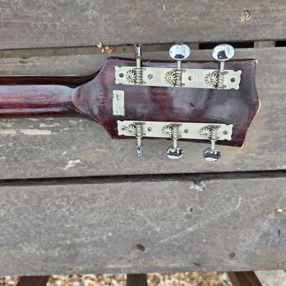This has been well plaid. I have shown any flaw I can. Back varnish seems crackeled. Little mark behind the neck shown. One string missing