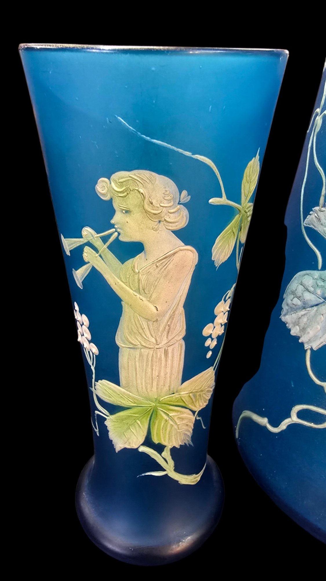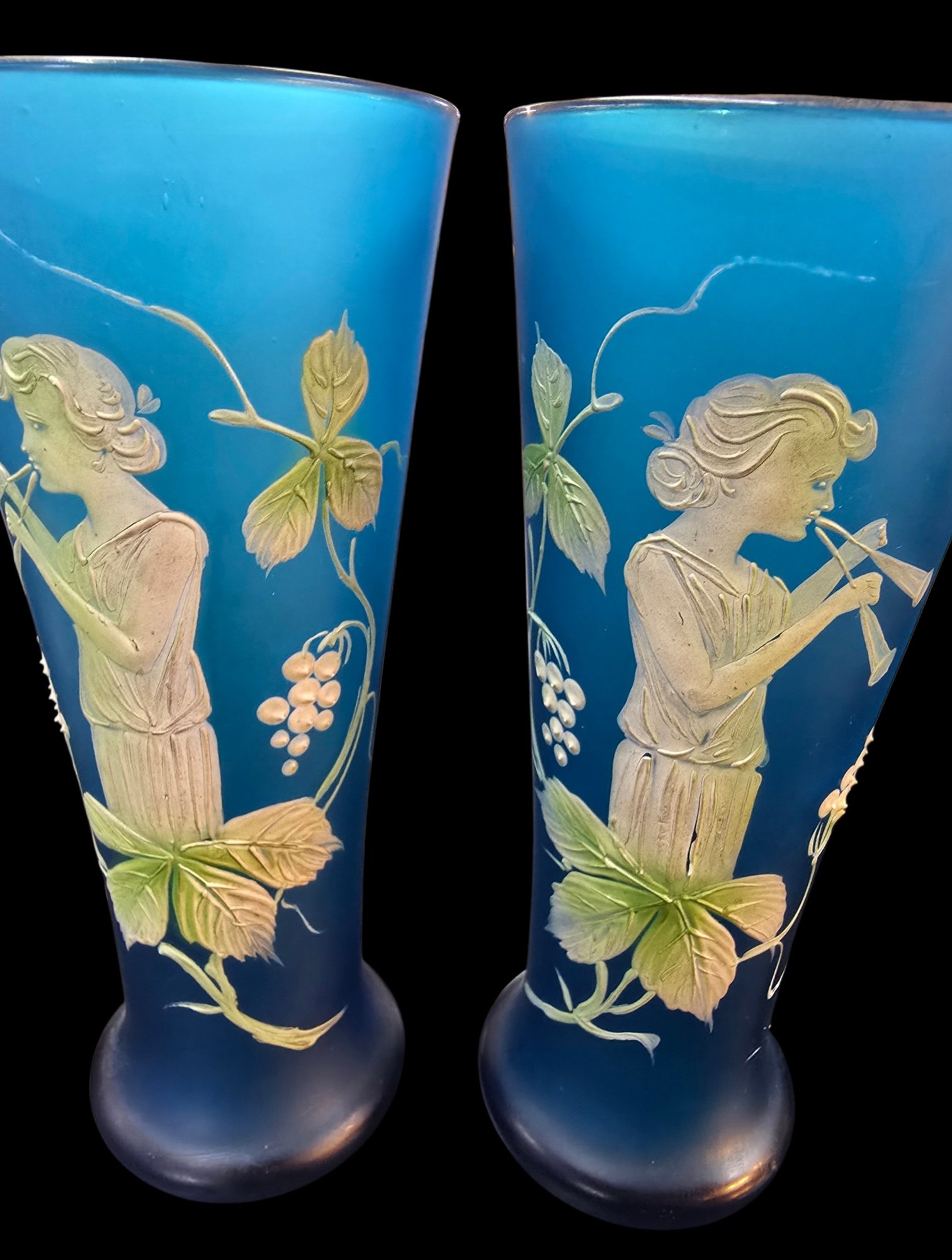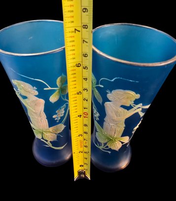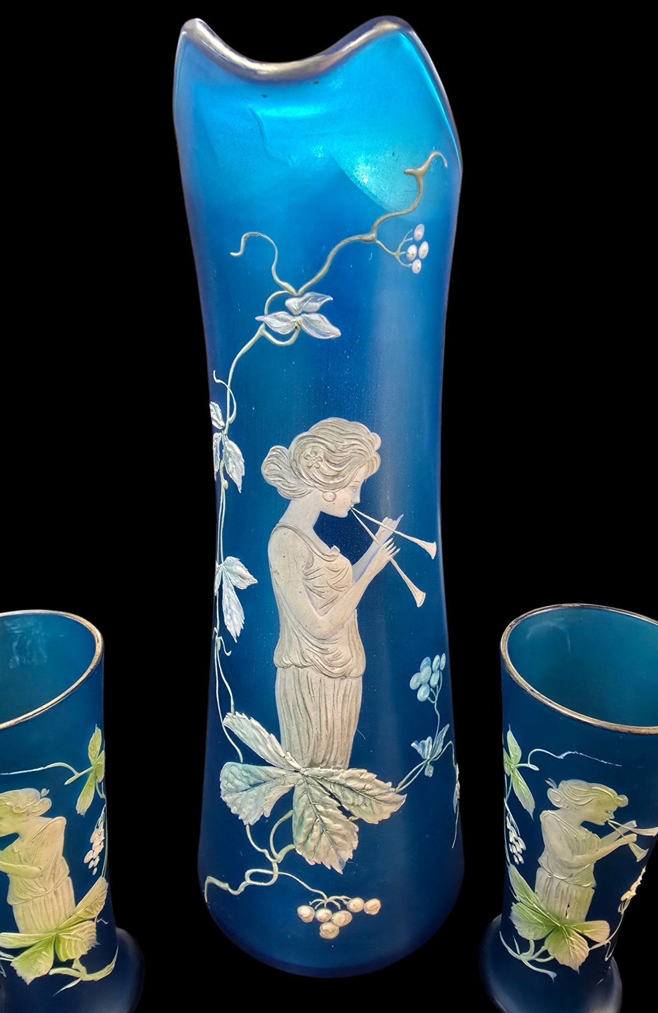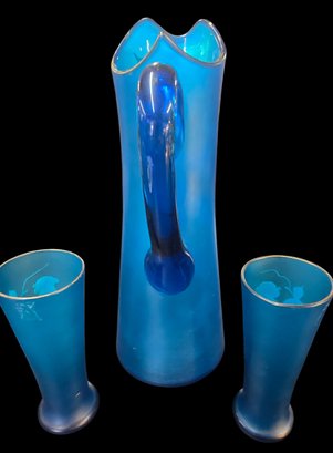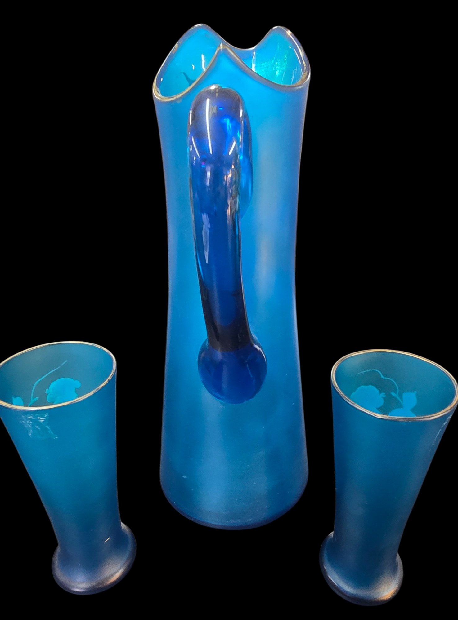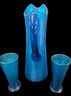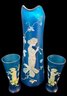 Antique 3 Piece Mary Gregory Style Blue Satin Glass Set Enamel Decoration Front