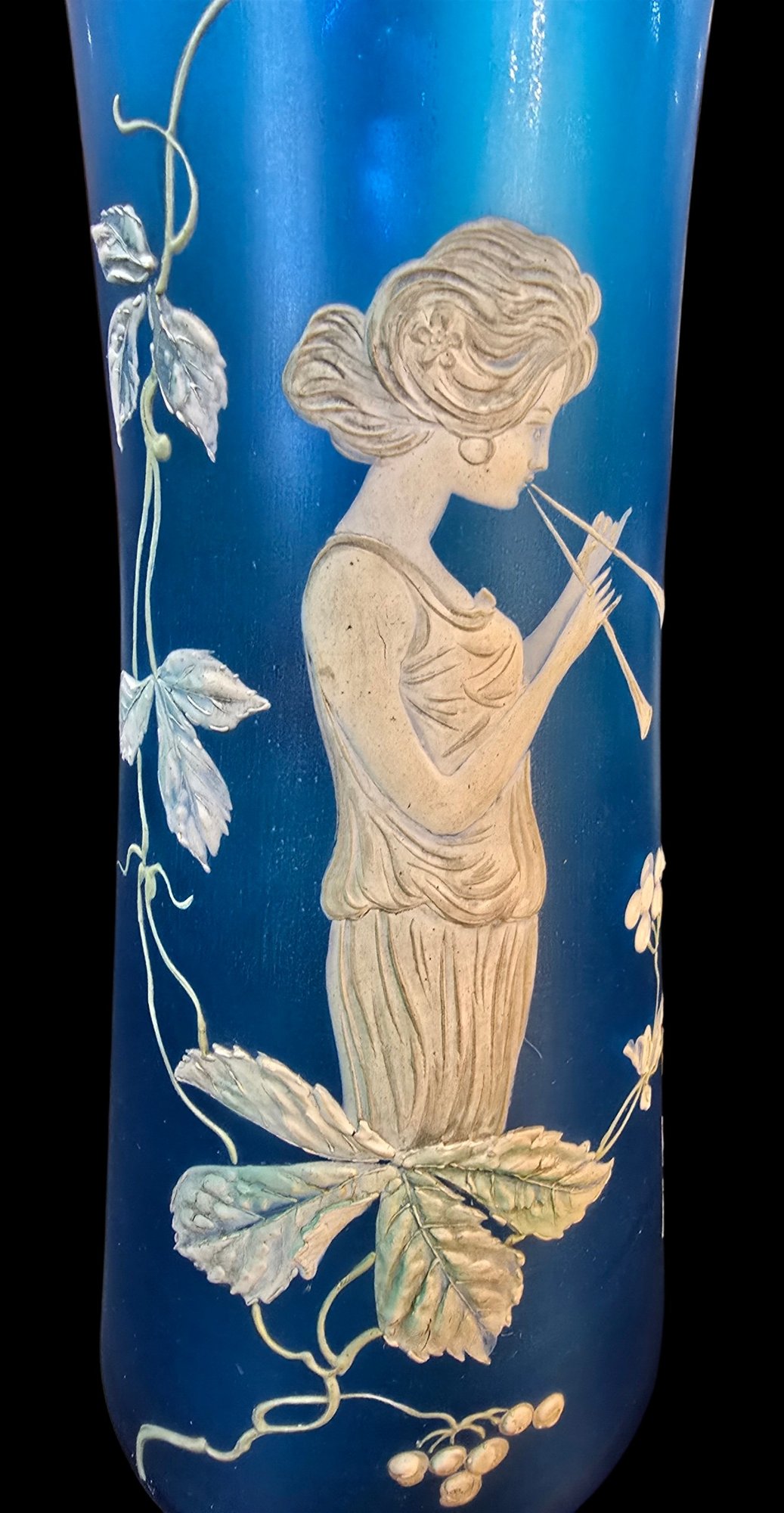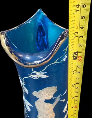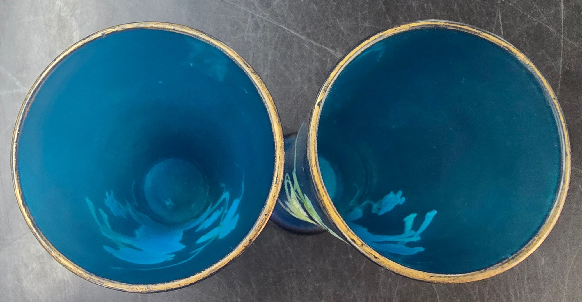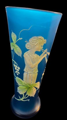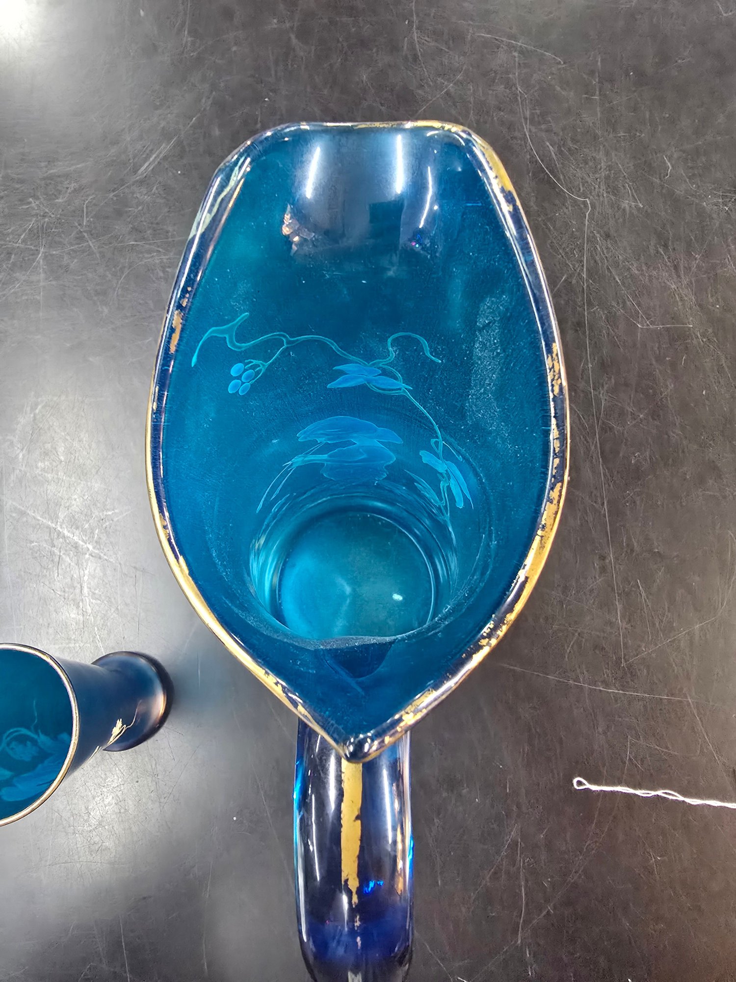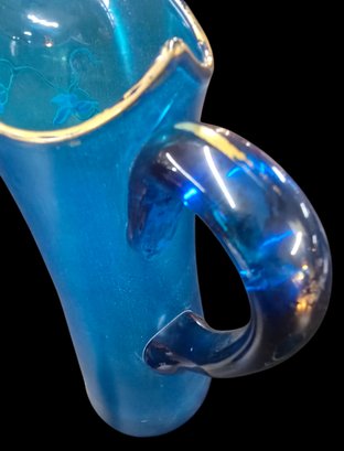 Antique 3 Piece Mary Gregory Style Blue Satin Glass Set Enamel Decoration Front