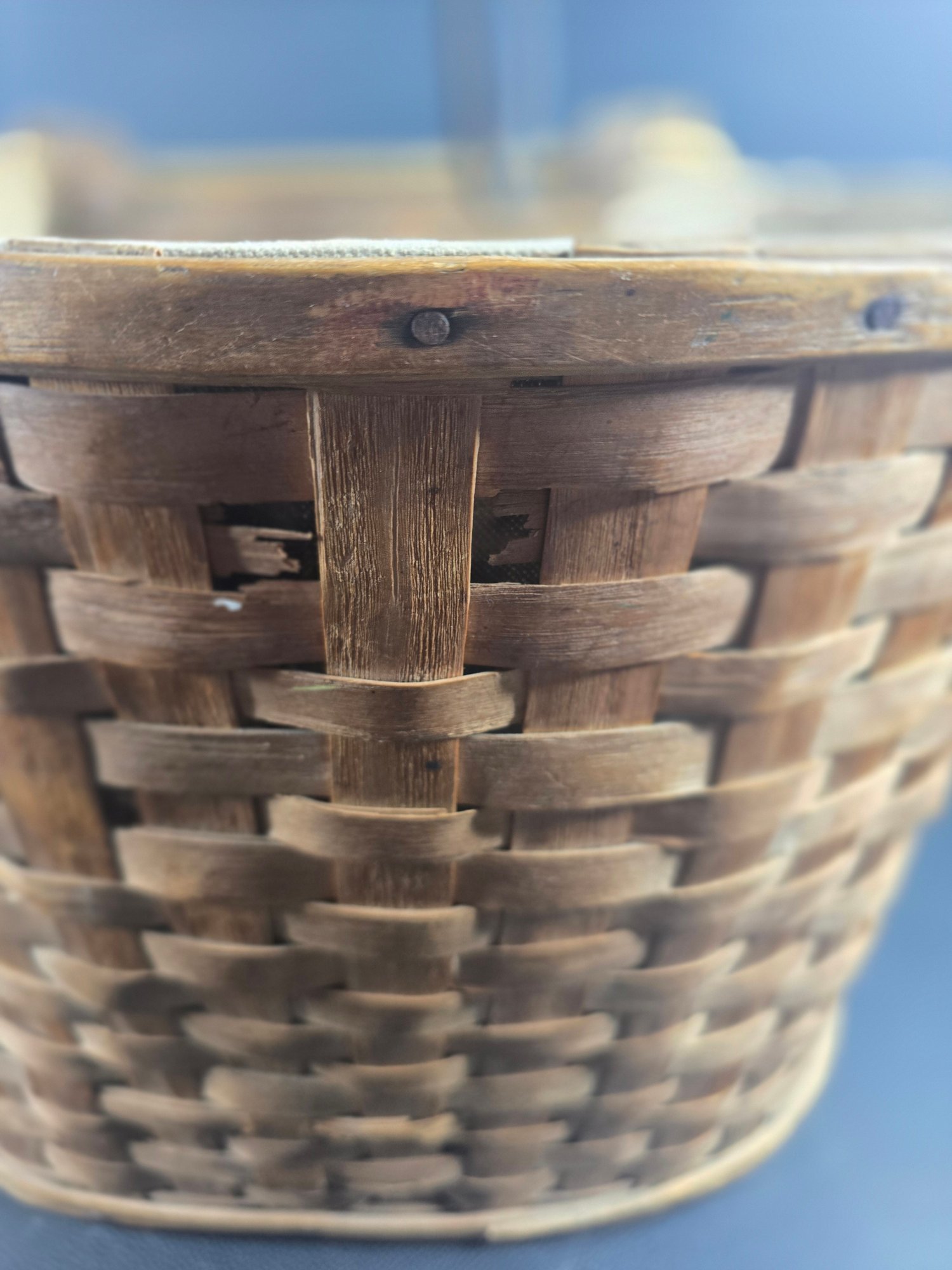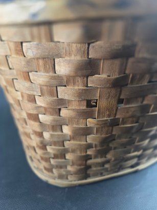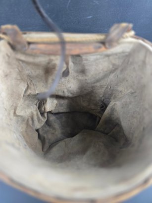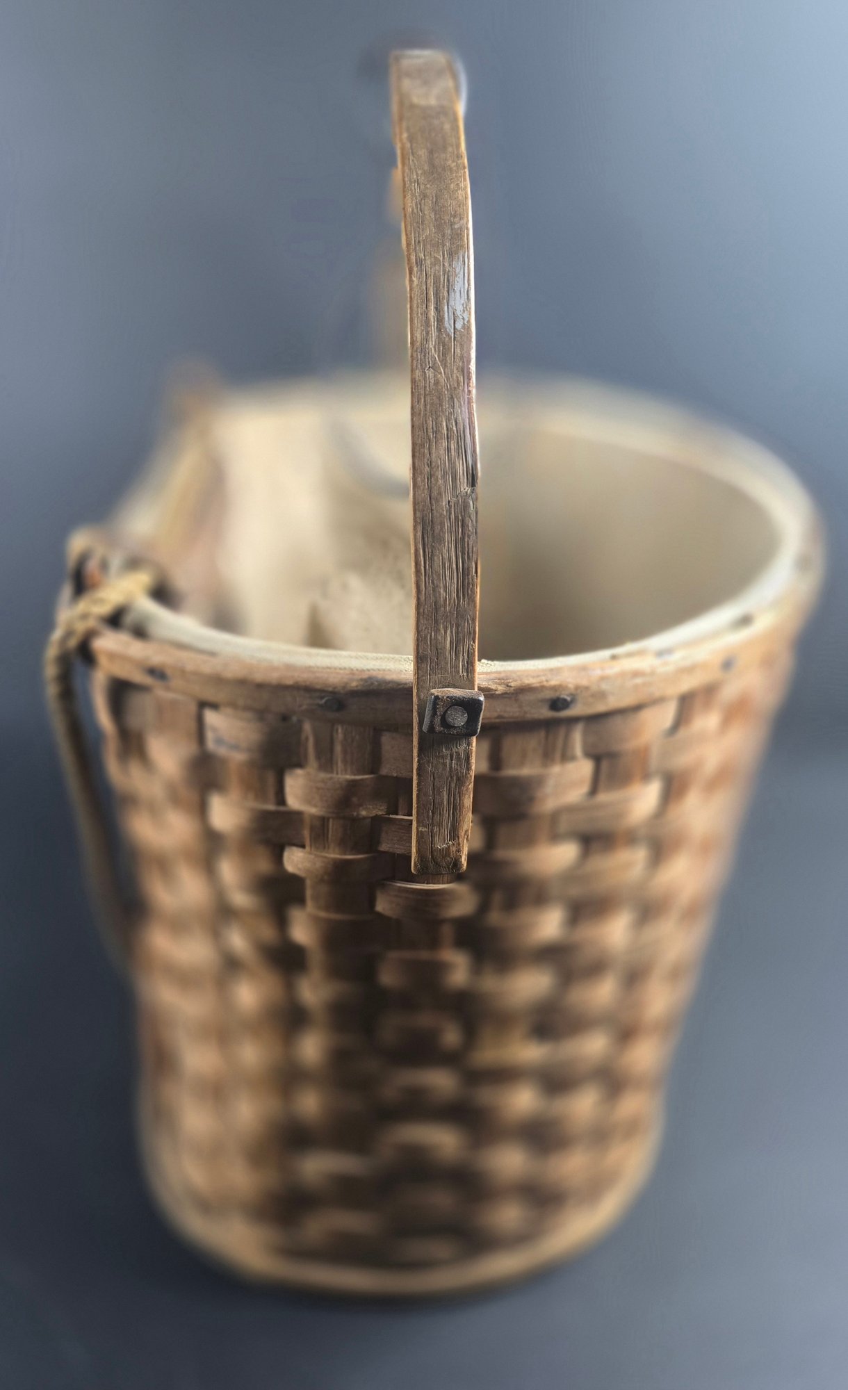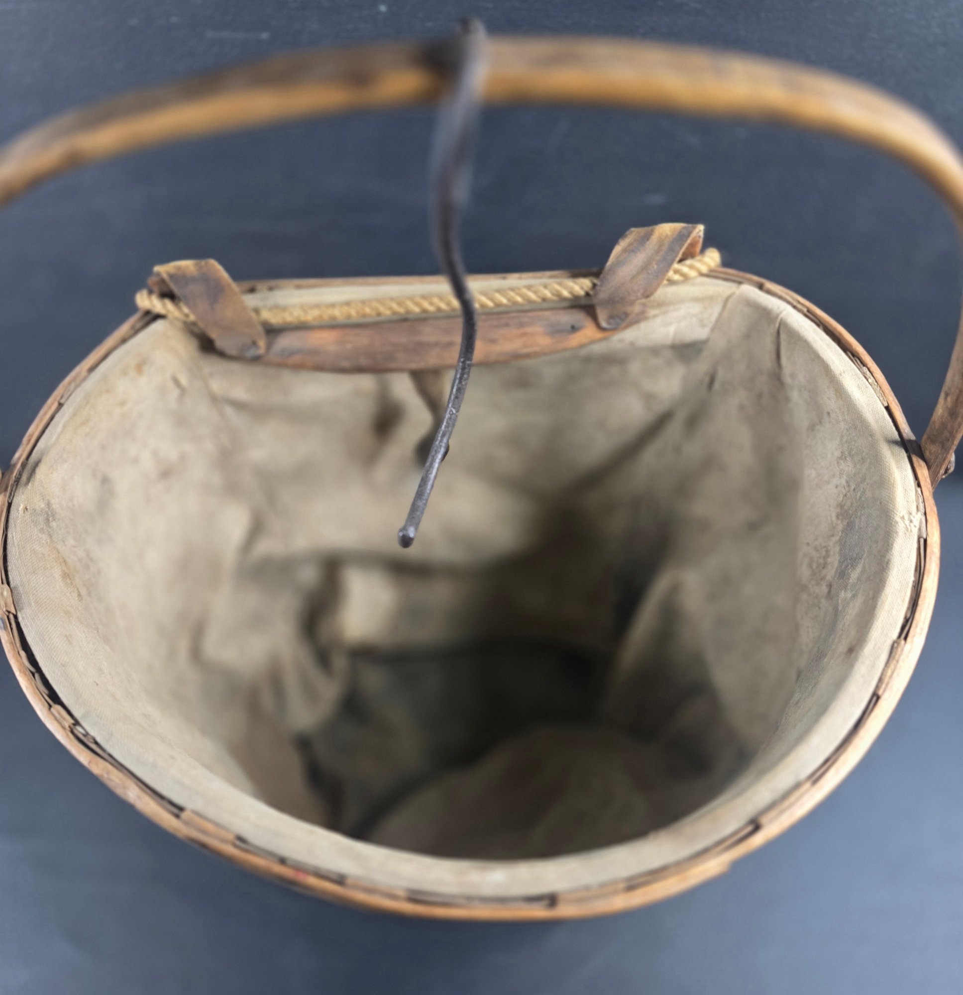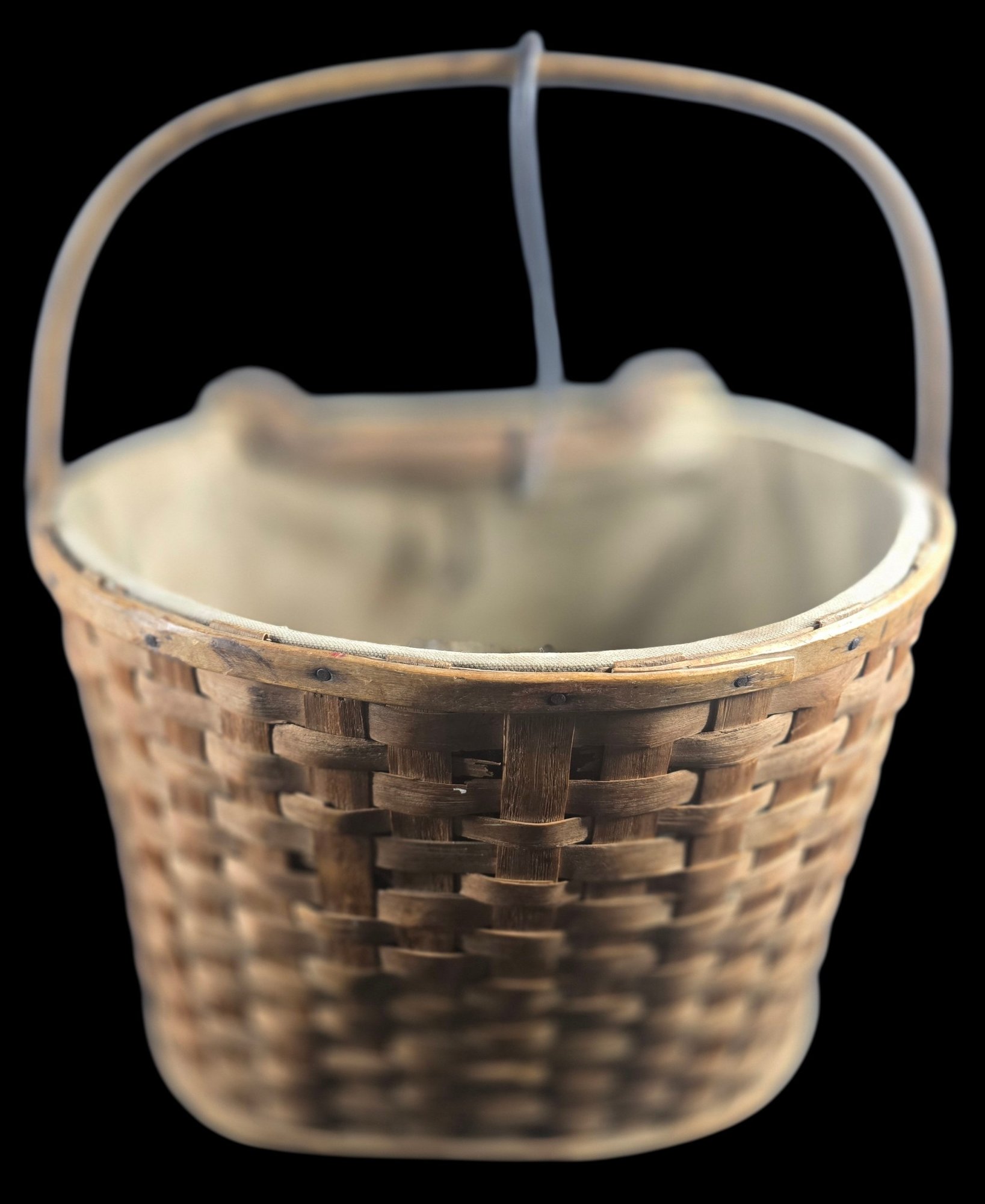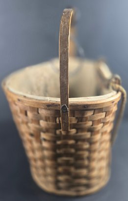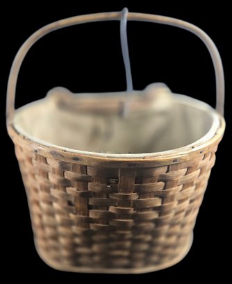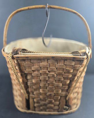 Antique Split Ash Apple Picking Basket Canvas Lining & Hanging Hook, very nice early basket