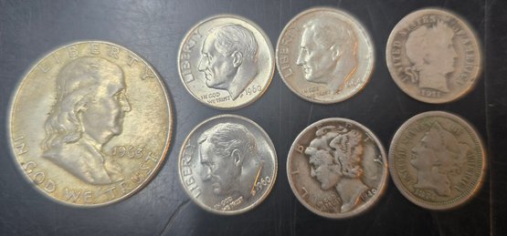 6 silver dimes and Franklin Half Dollar