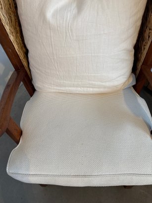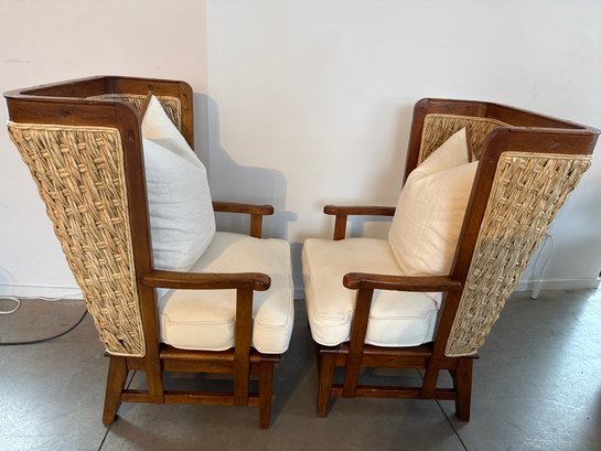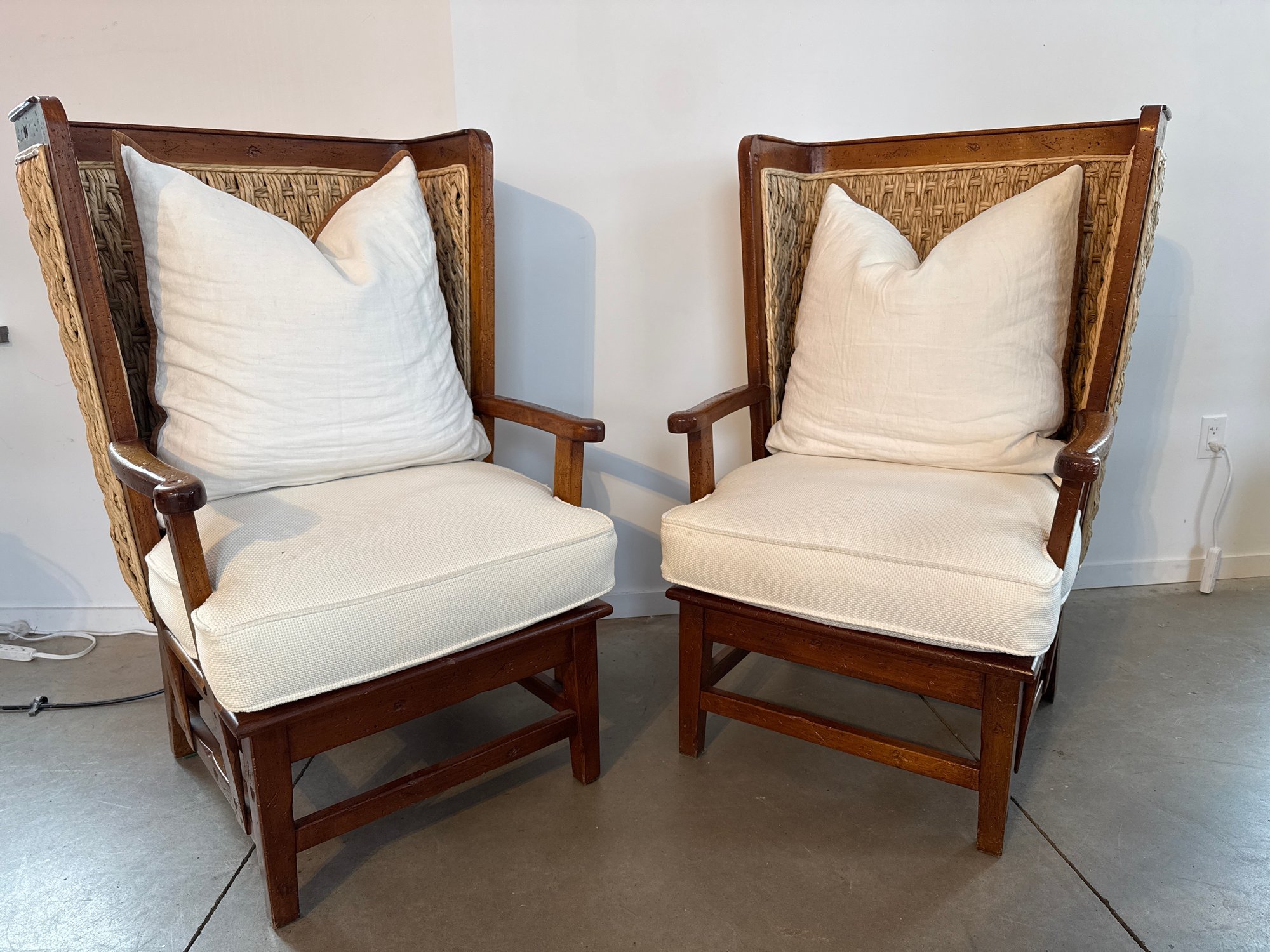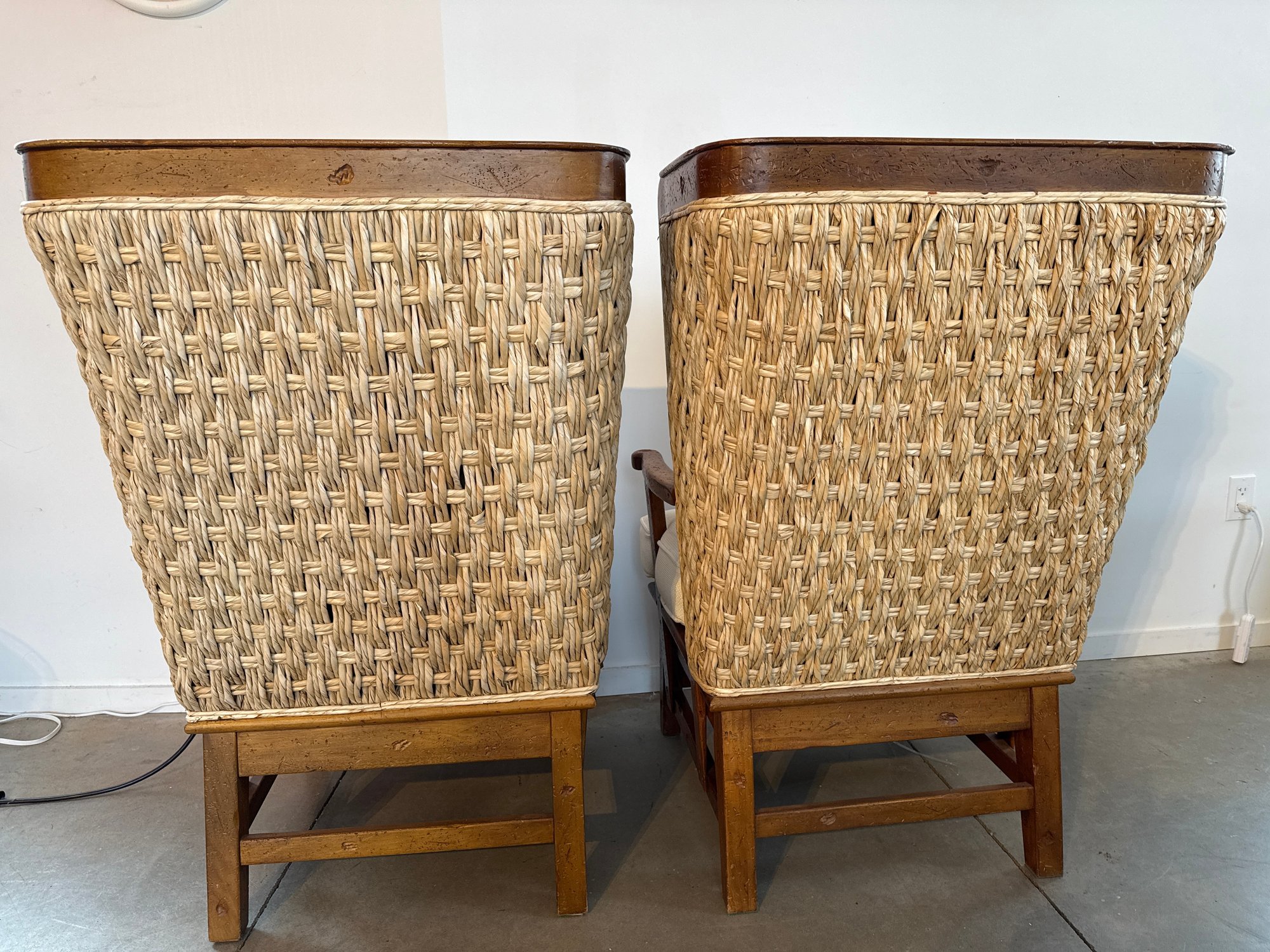 Ralph Lauren British Colonial style woven back armchair in a mahogany finish with natural abaca rope woven at the exterior back and sides.