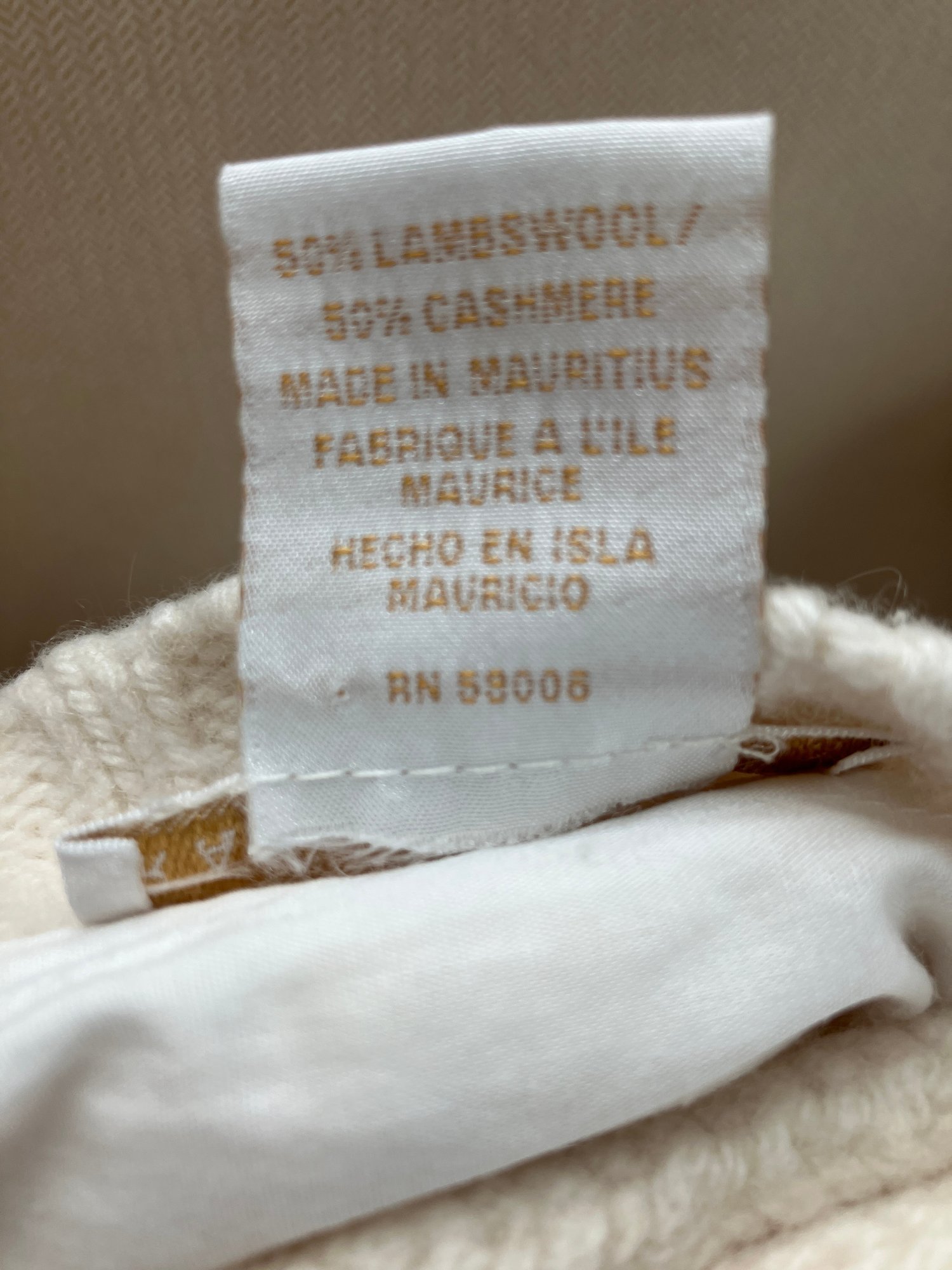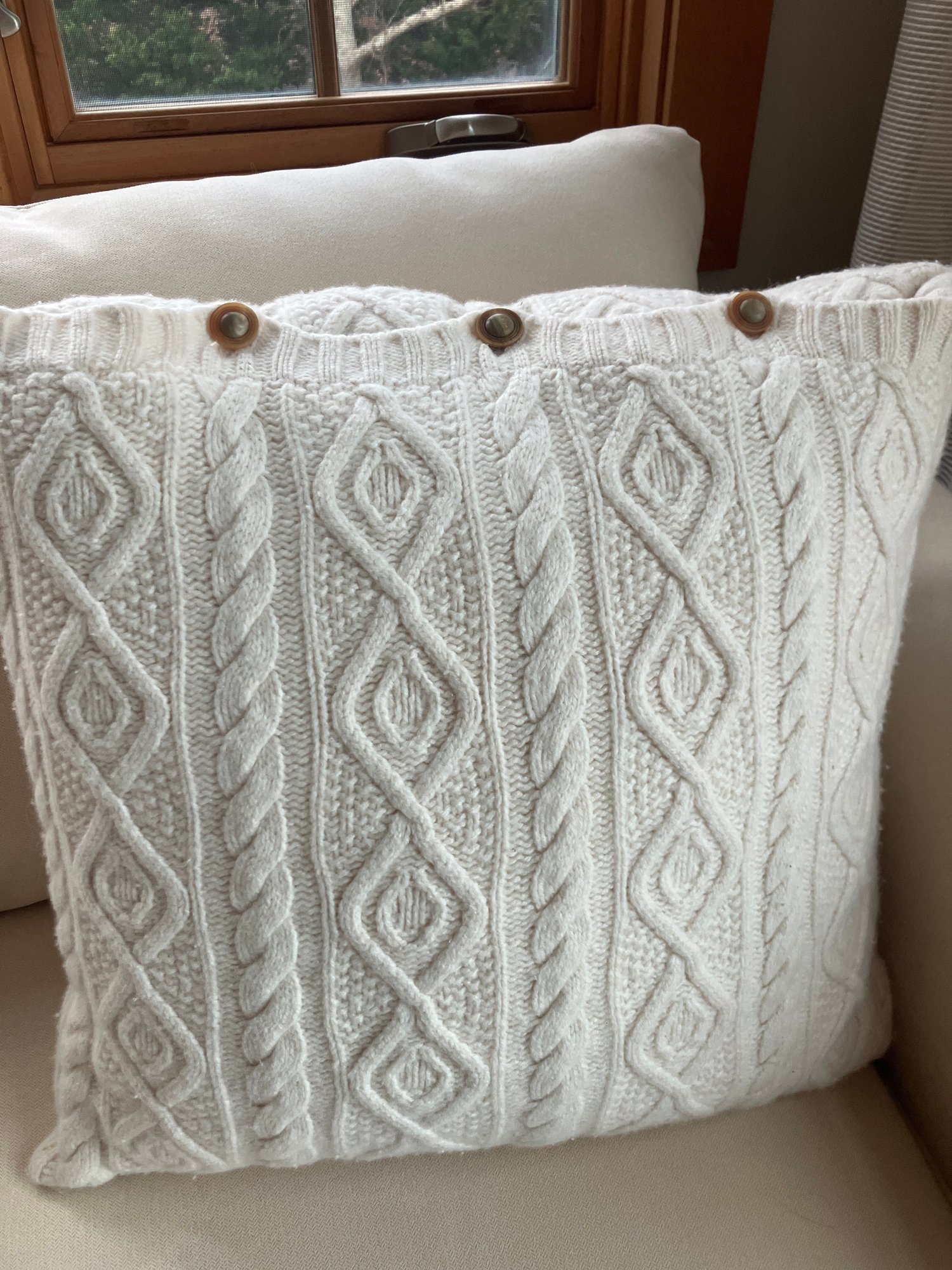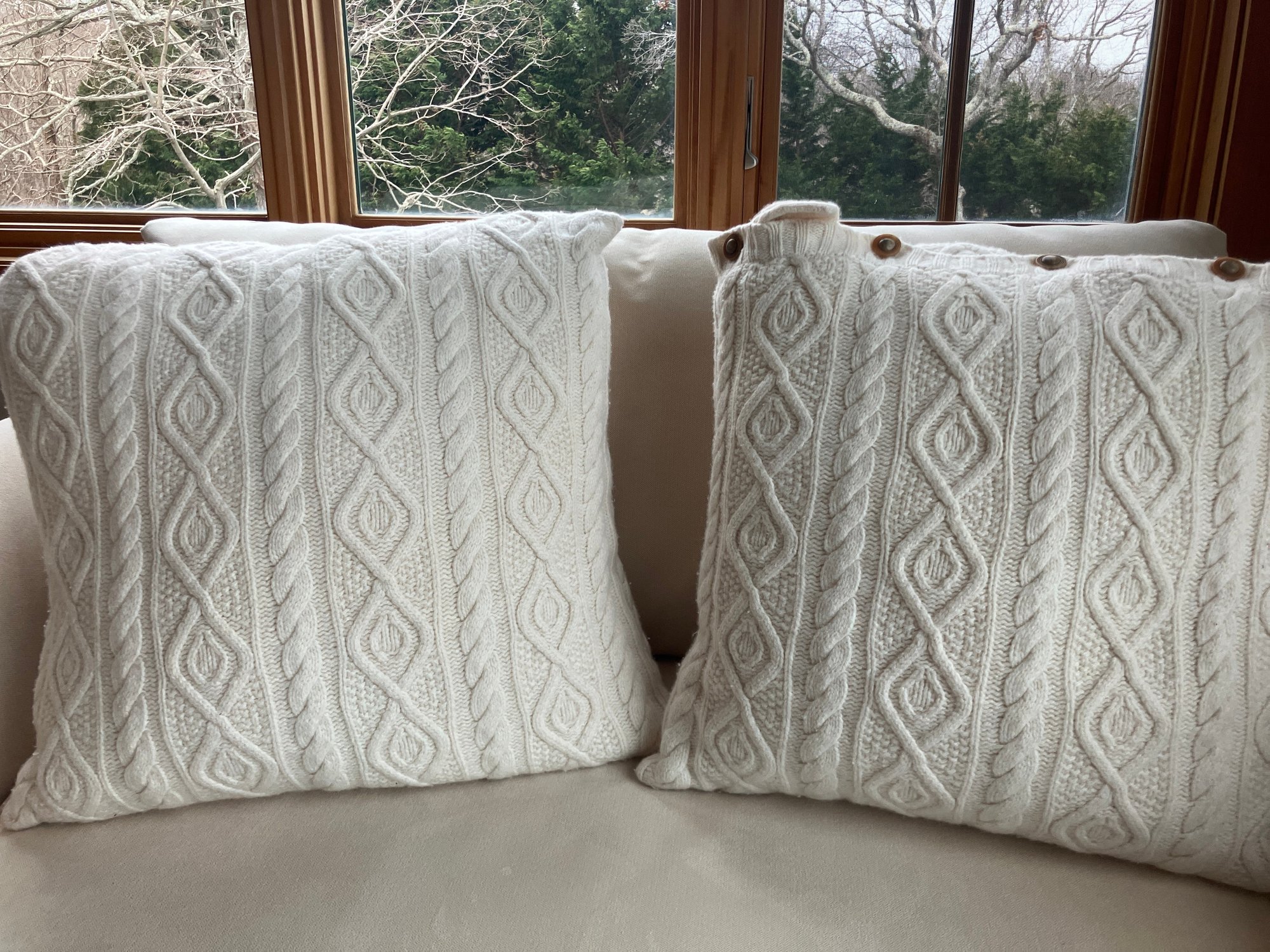 Lambswool and cashmere fisherman knit pillow covers with feather inserts. One missing button. Very good condition,