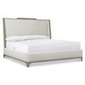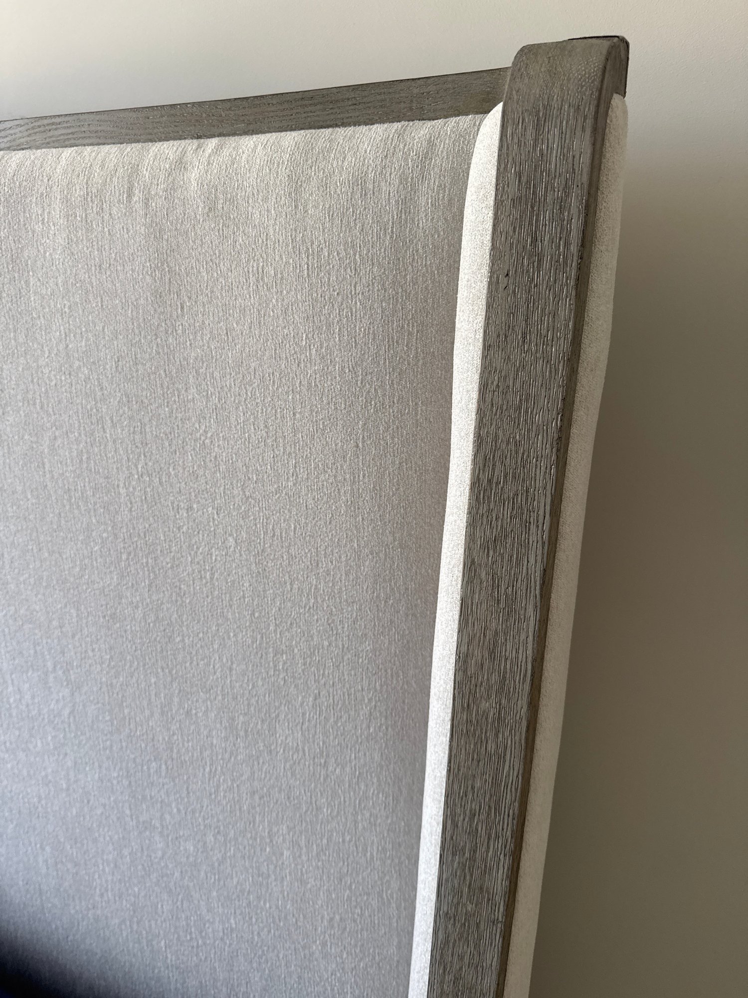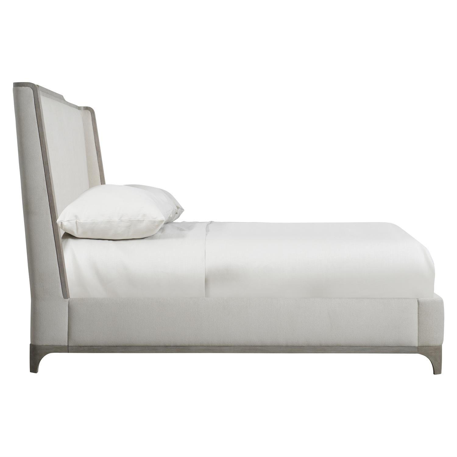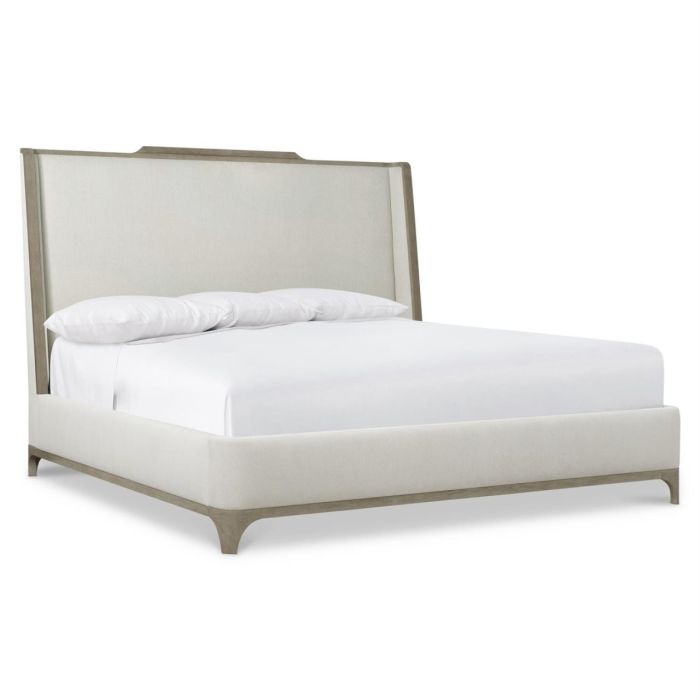 The upholstered shelter bed headboard embraces the look of relaxed casual design. With a shaped upholstered headboard wrapped in a wooden frame, the Albion shelter bed takes its inspiration from wingback chairs, creating its own cocoon of comfort. Sweeping lines are highlighted by the wood outline, finished in a casually chic Pewter. A softly upholstered footboard and side rails complement the tall upholstered headboard.