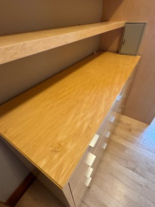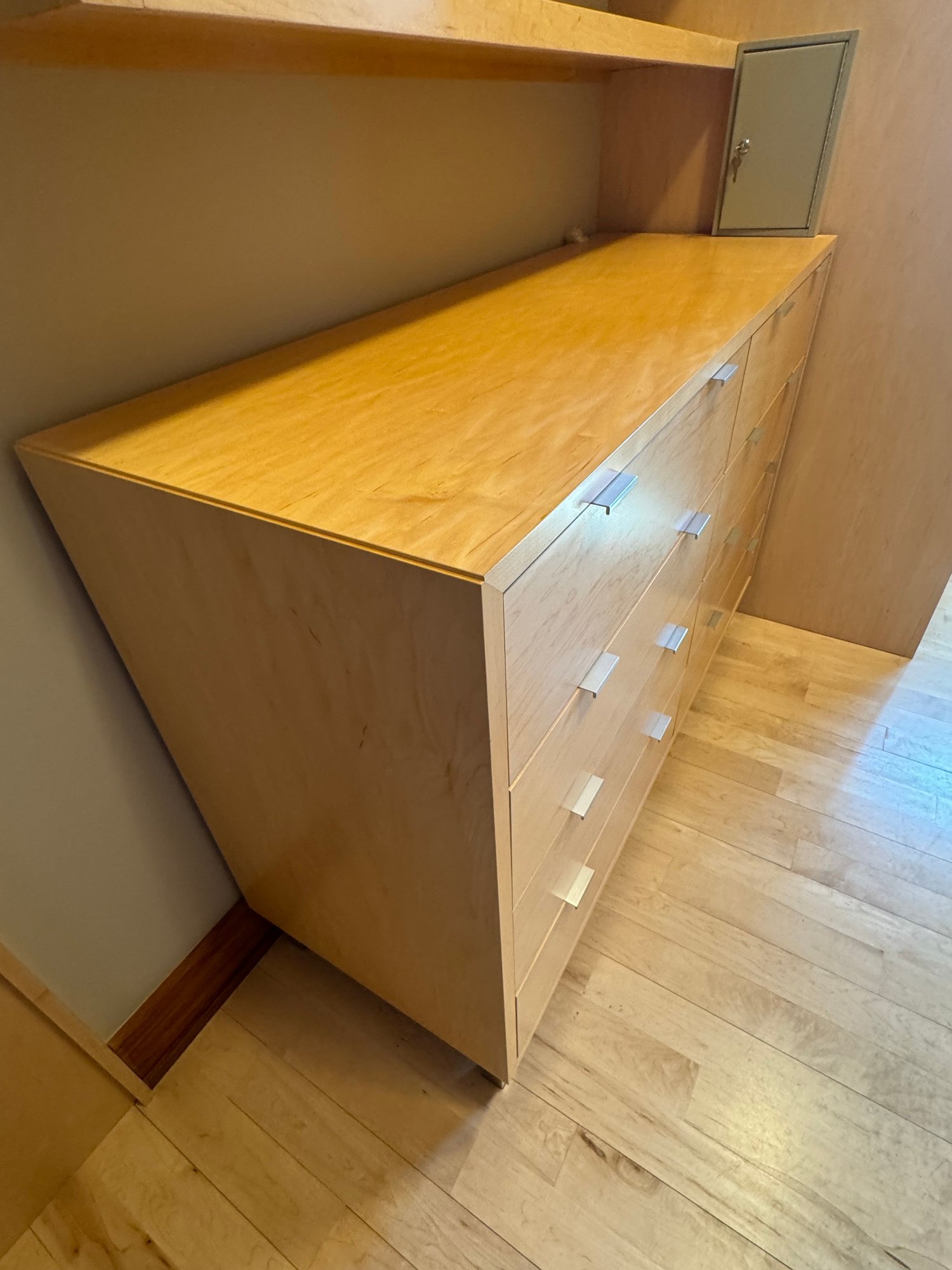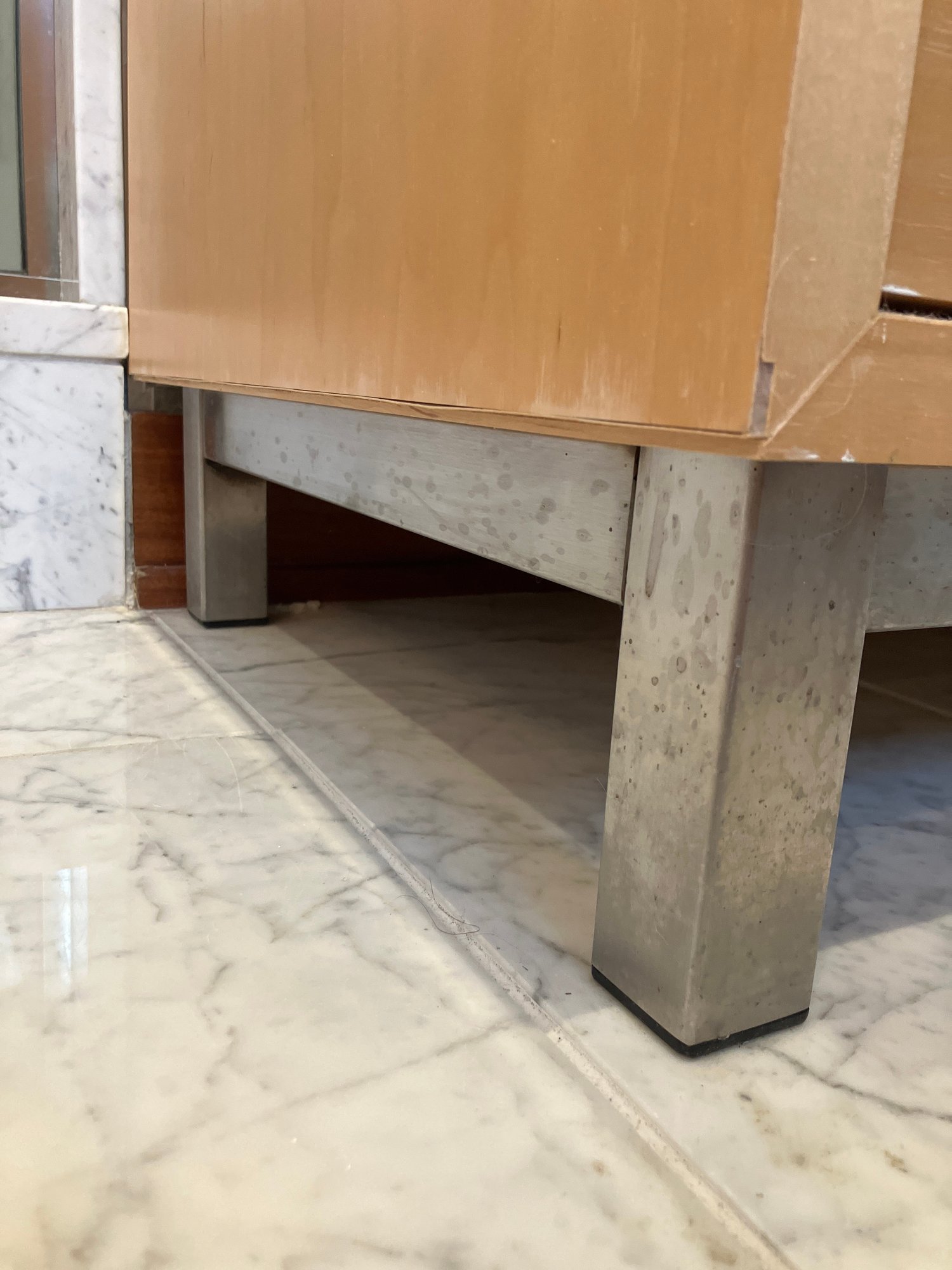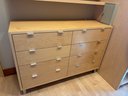 Eight drawers, brushed chrome poles. Some wear on veneer top. Metal base.