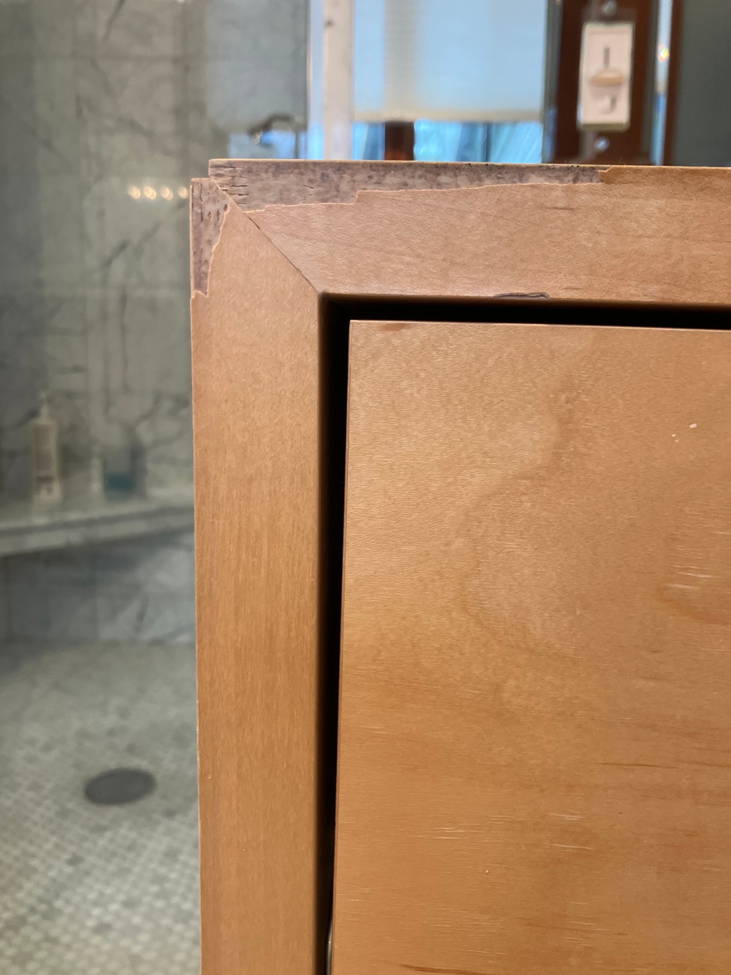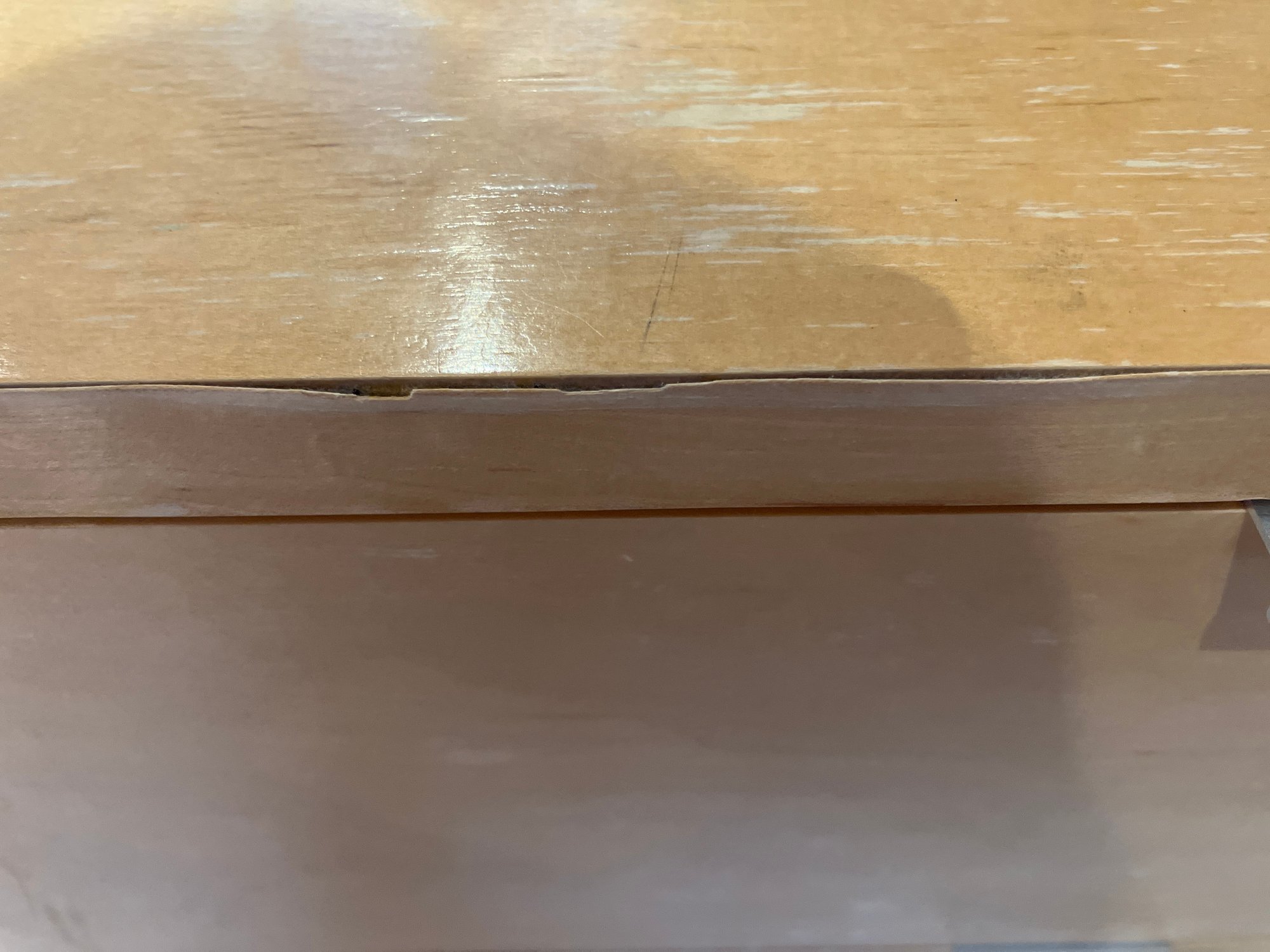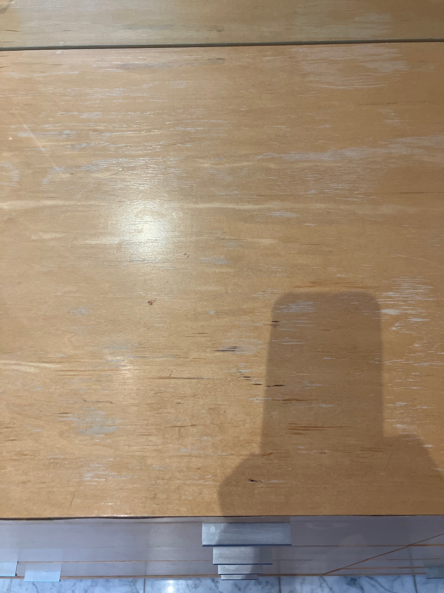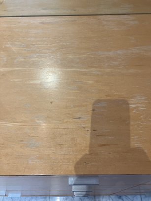 Eight drawers, brushed chrome poles. Some wear on veneer top. Chipped veneer on front. Metal base.