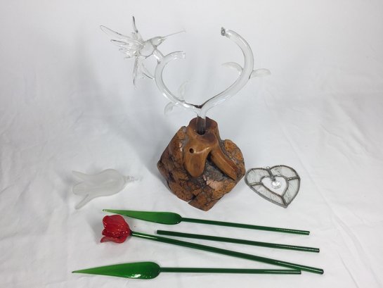 Glass And Wood Display And Additional Glass Decor (see Photos For Condition- Some Repairs Needed)
