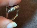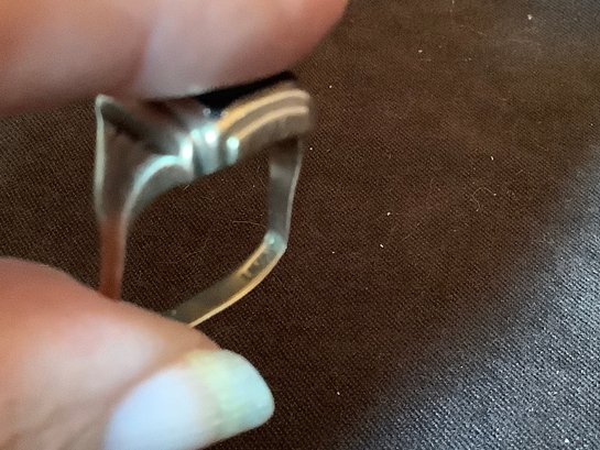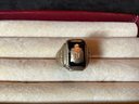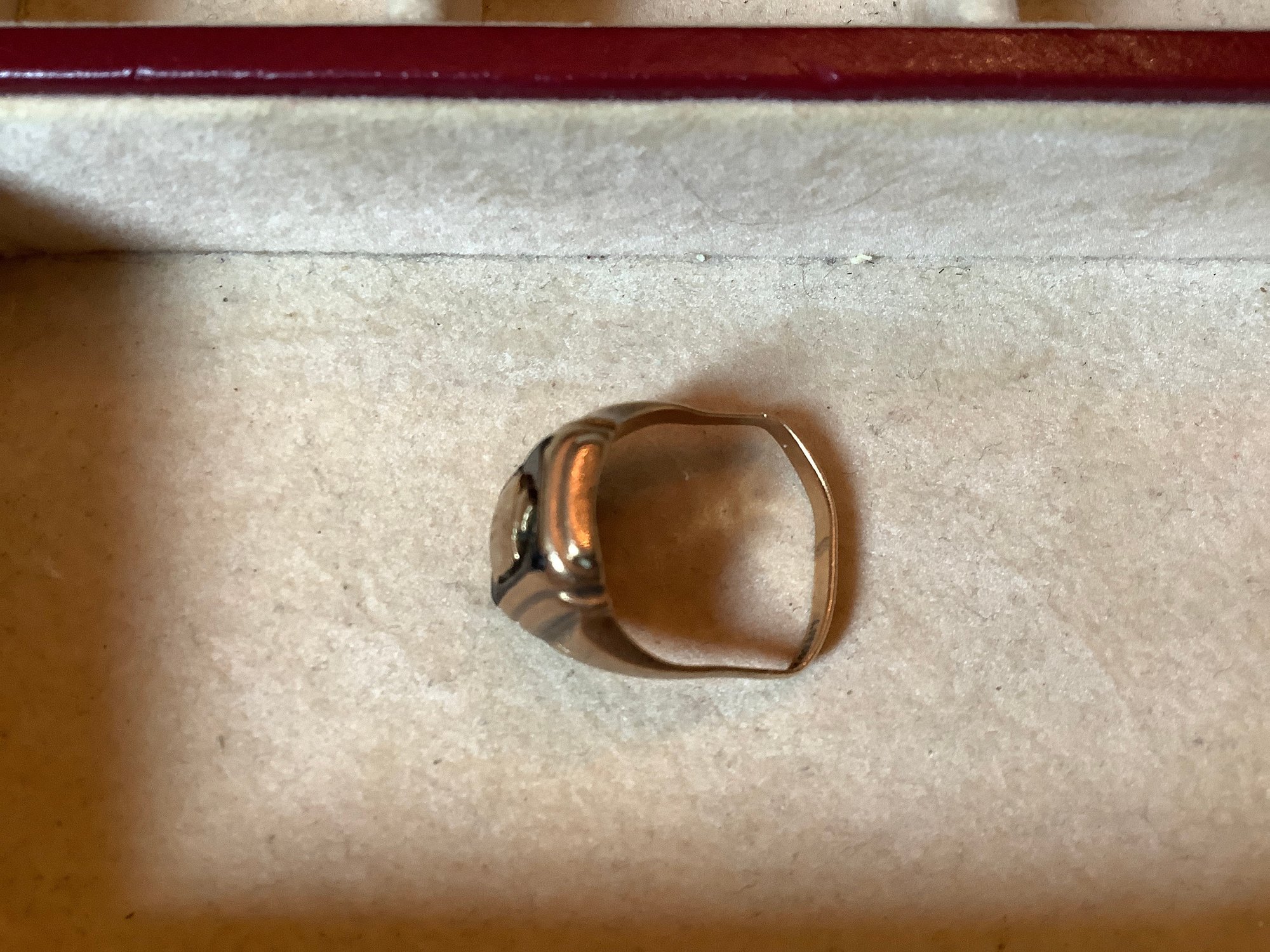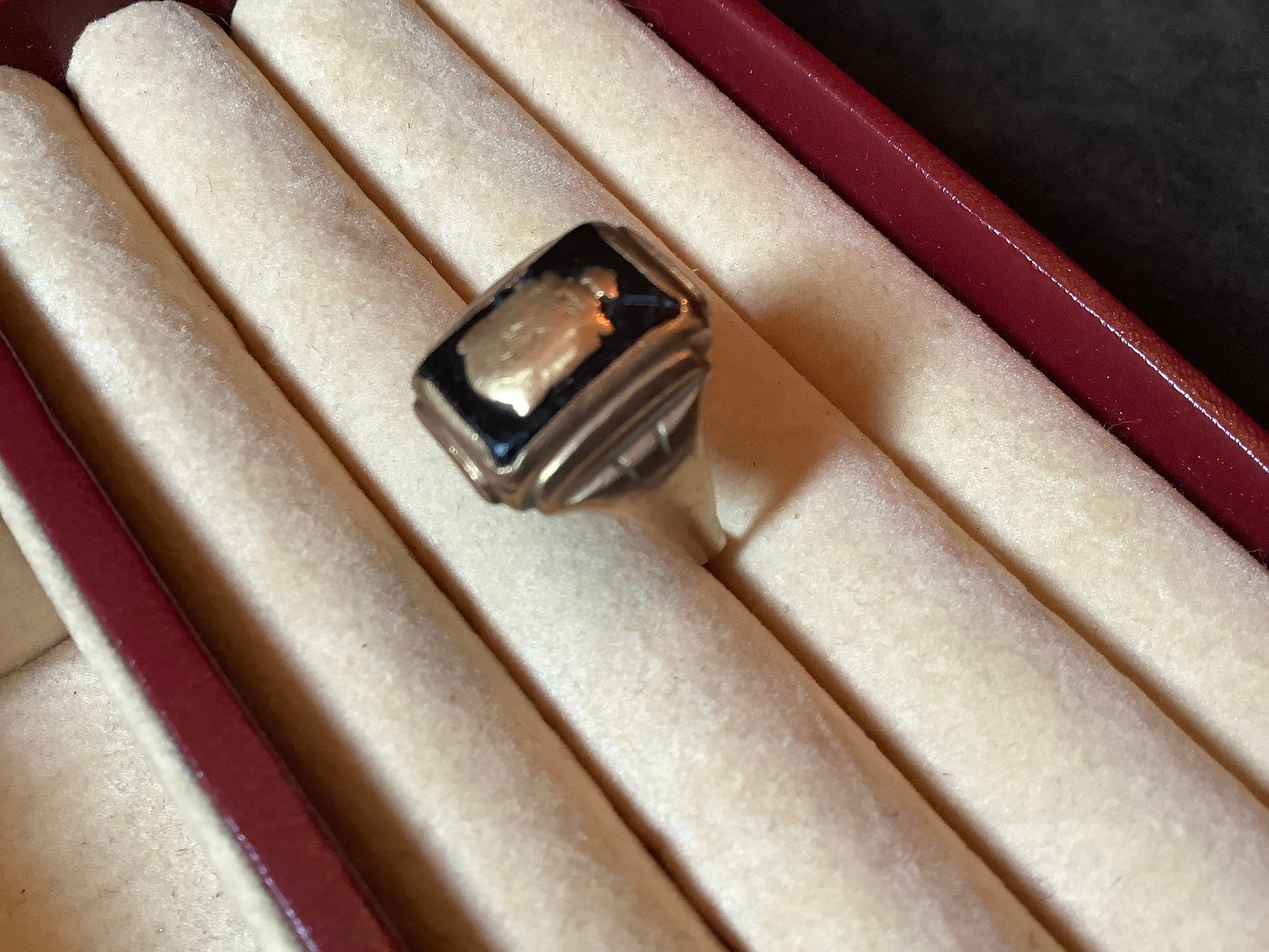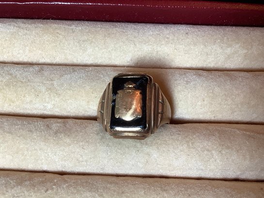 This is an older ring offering a scholarly design. The ring is marked 10 kt gold with a black onyx background that highlights the gold center. The ring originally had a sizer on it so it is not perfectly round. See photos.