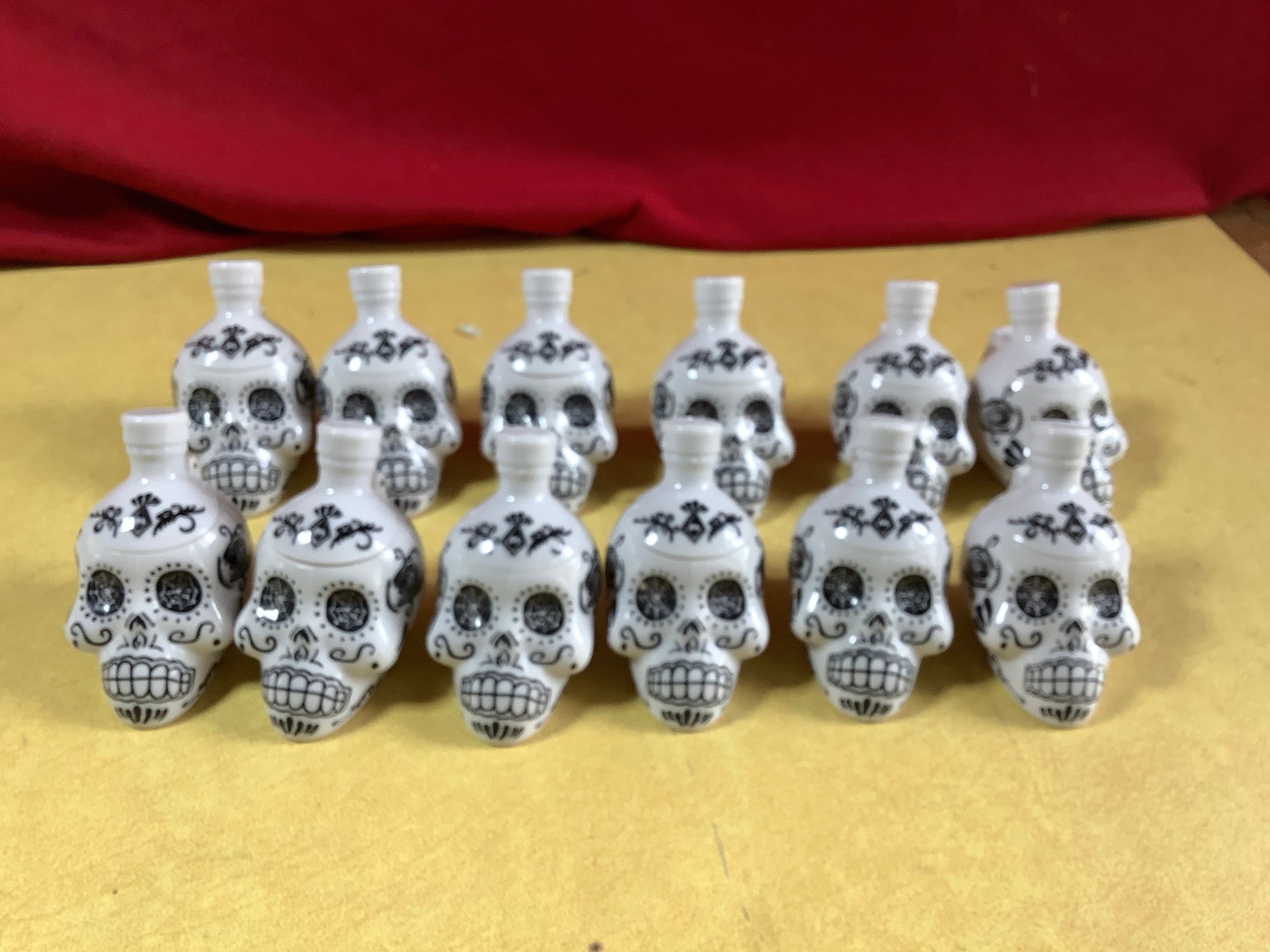 12 KAH Tequila plastic shot glasses. .They are Day of the Dead theme, with hinged top. Photos are part of the description.